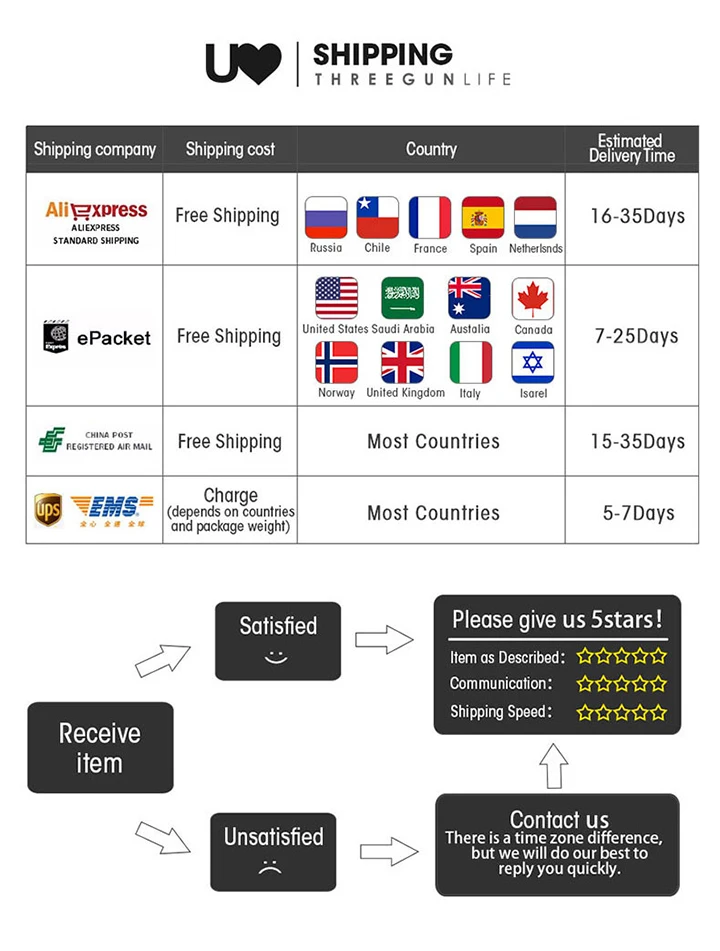 Packages from our warehouse in China will be shipped by ePacket or EMS depending on the weight and size of the product. Packages shipped from our US warehouse are shipped through USPS.