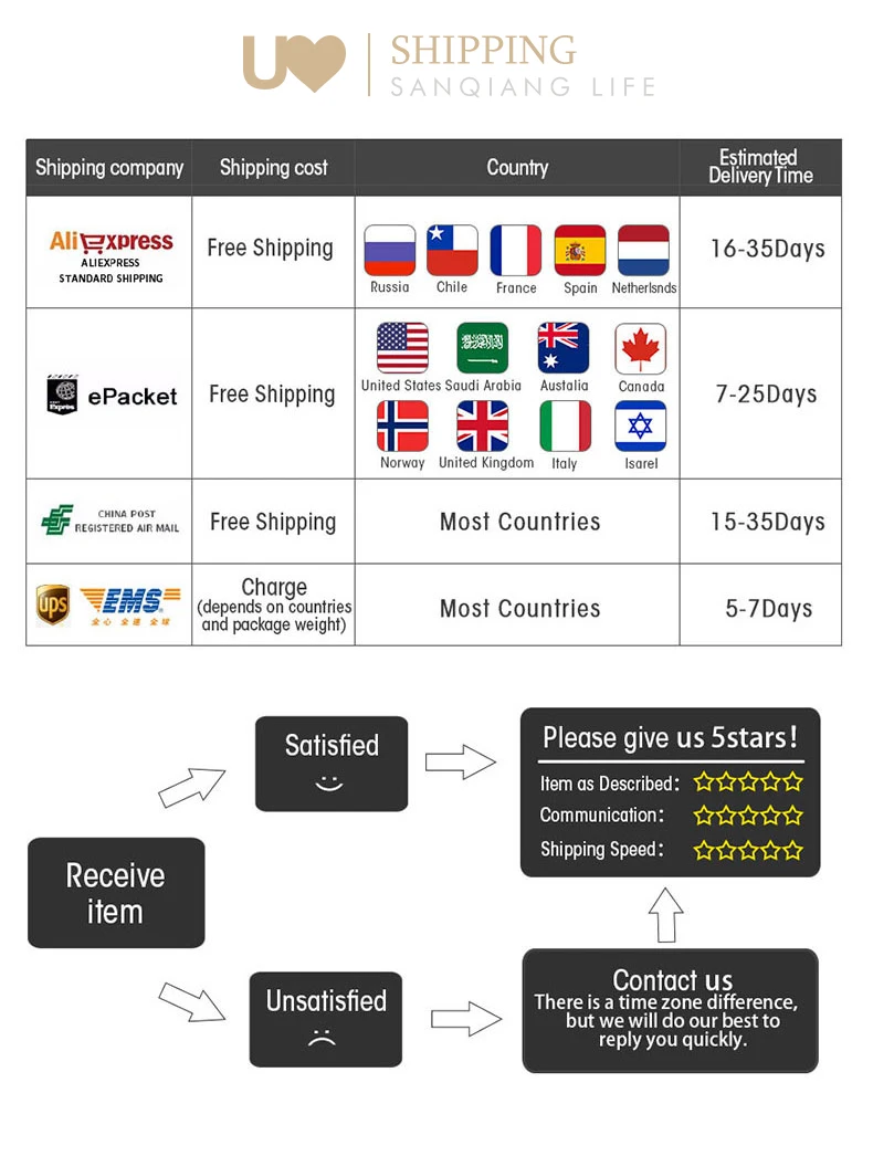 Packages from our warehouse in China will be shipped by ePacket or EMS depending on the weight and size of the product. Packages shipped from our US warehouse are shipped through USPS.