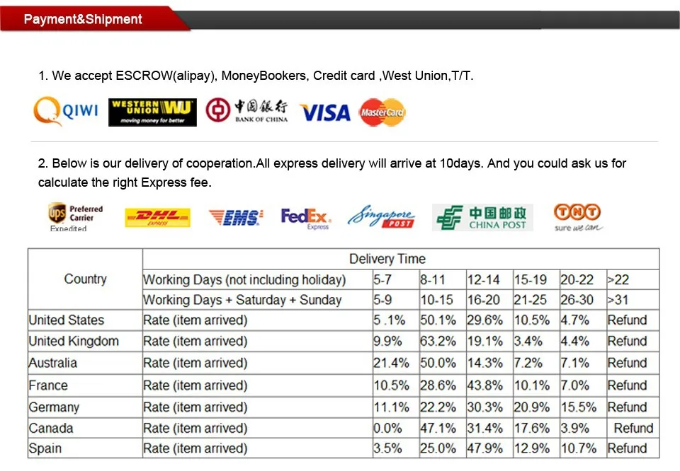 • If you did not receive the product within the guaranteed time( 45 days not including 2-5 day processing) you can request a refund or a reshipment.