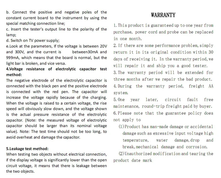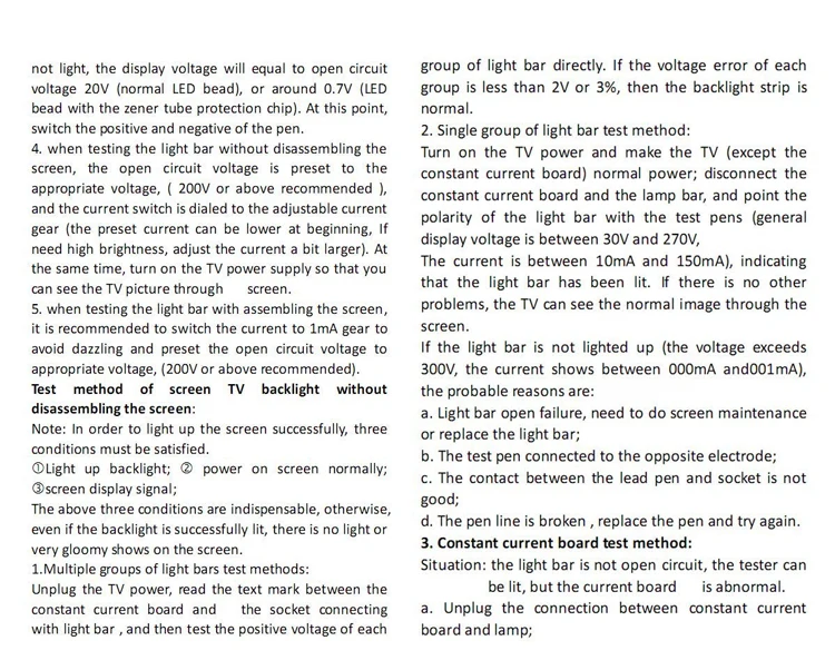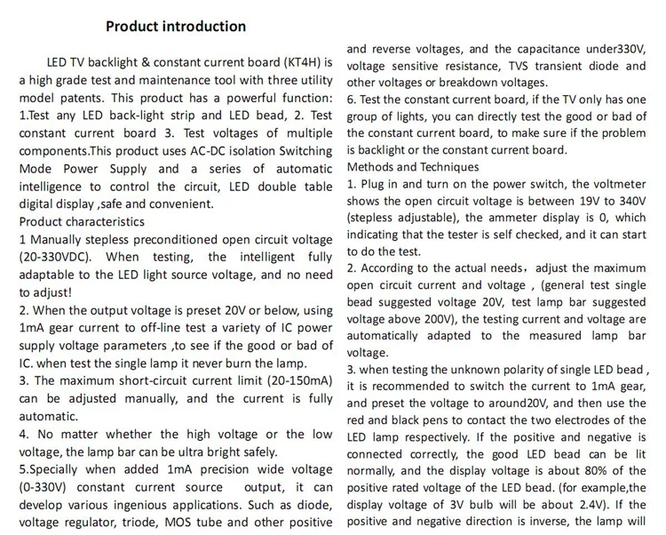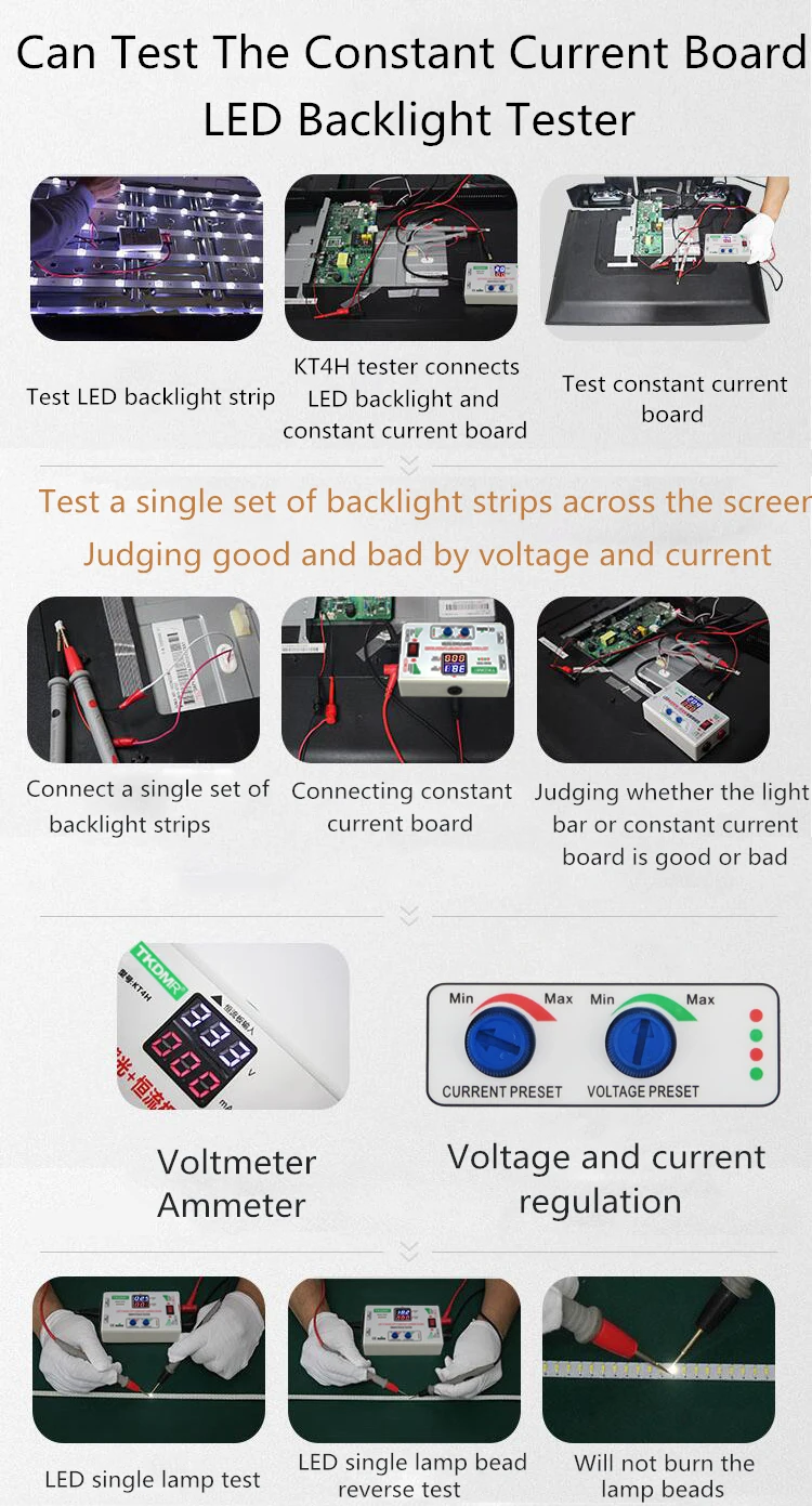 This product has a powerful function: 1.Test any LED back-light strip and LED bead, 2. Test constant current board 3. Test voltages of multiple components.