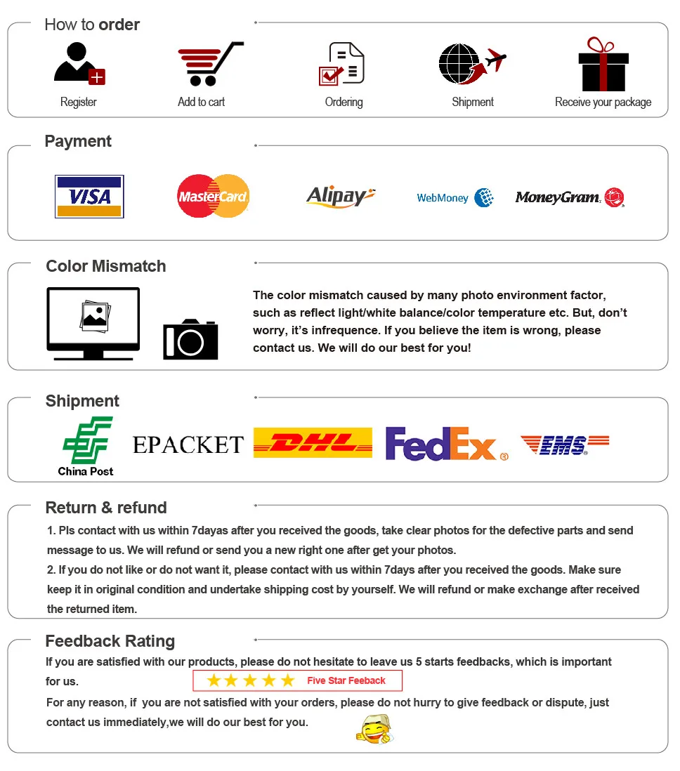 • If you did not receive the product within the guaranteed time( 45 days not including 2-5 day processing) you can request a refund or a reshipment.