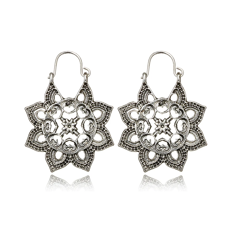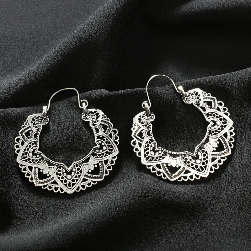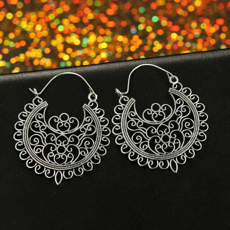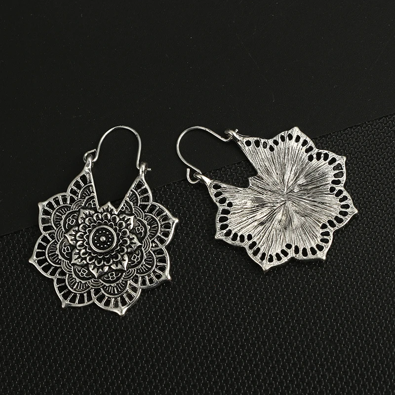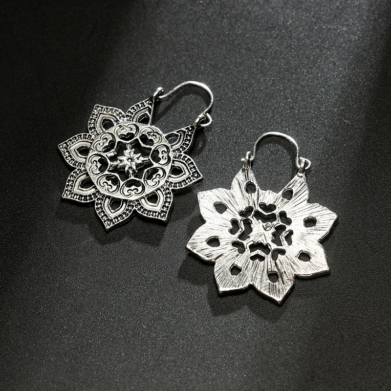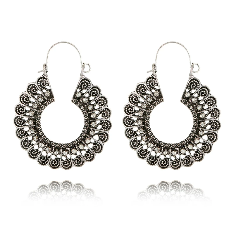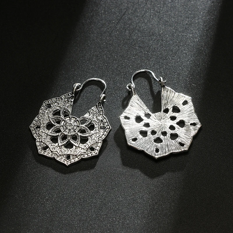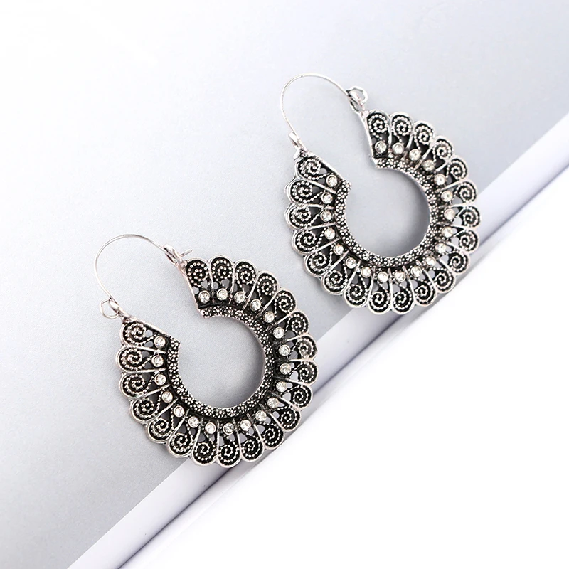Tocona Vintage Antique Silver Hollow Flower Lotus Crystal Hoop Earrings Ethnic Carved Earring Brincos for Women Jewelry