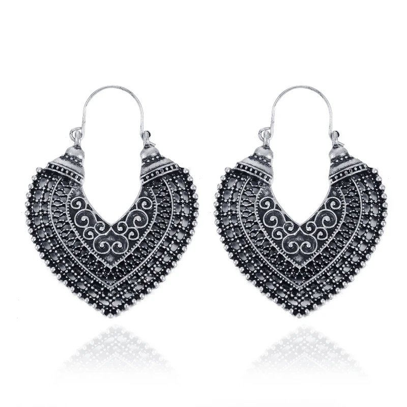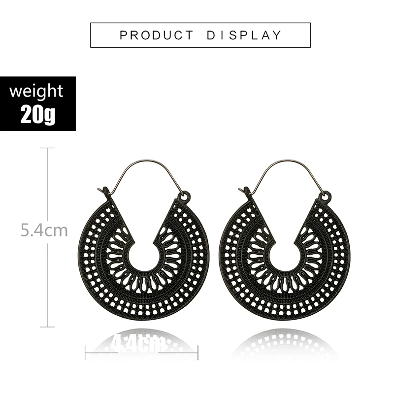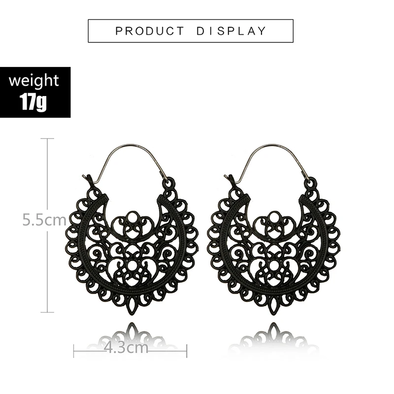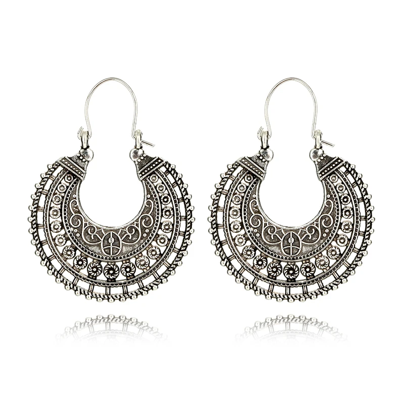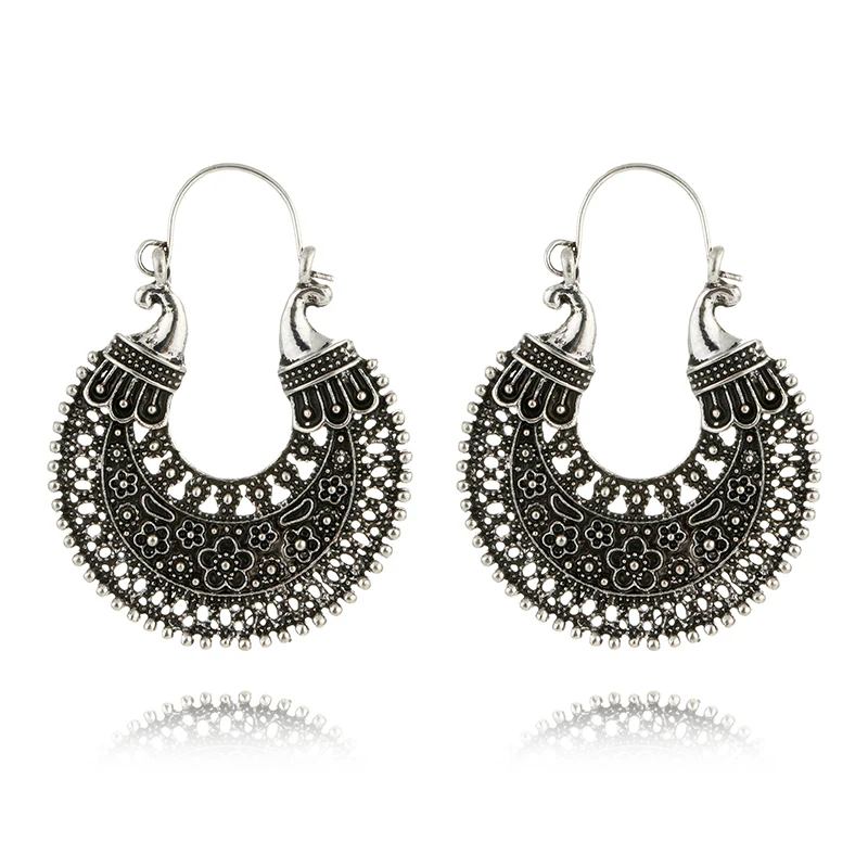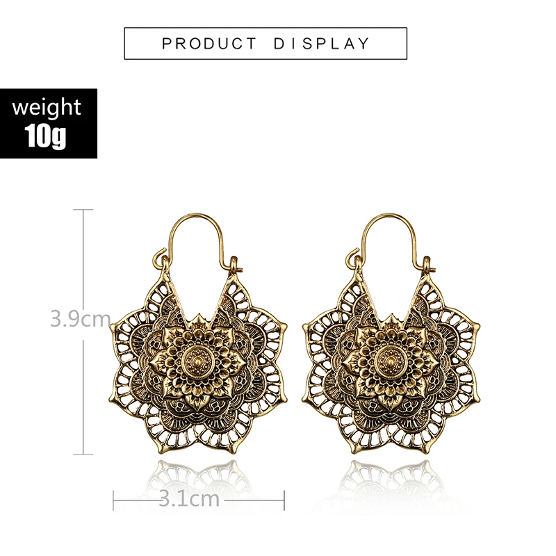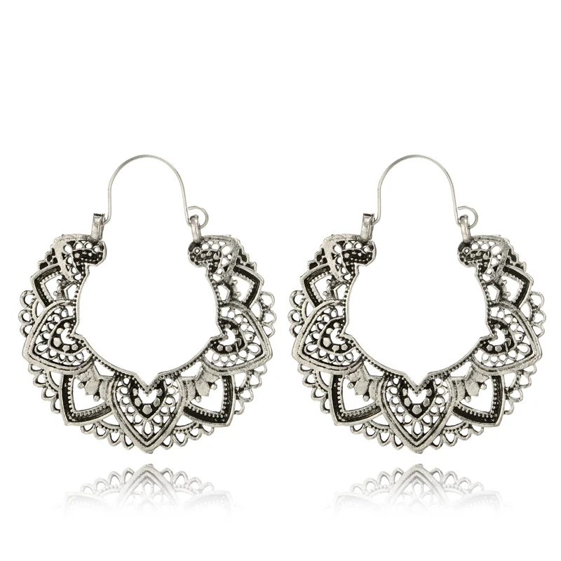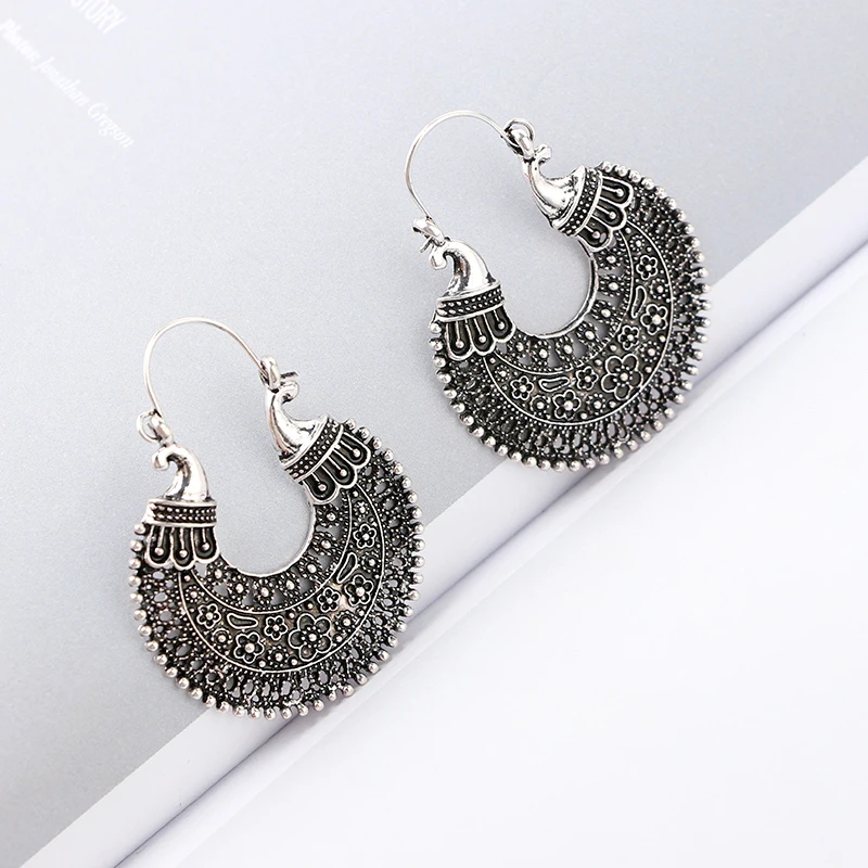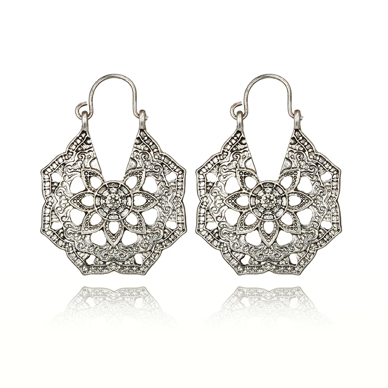 Tocona Vintage Antique Silver Hollow Flower Lotus Crystal Hoop Earrings Ethnic Carved Earring Brincos for Women Jewelry