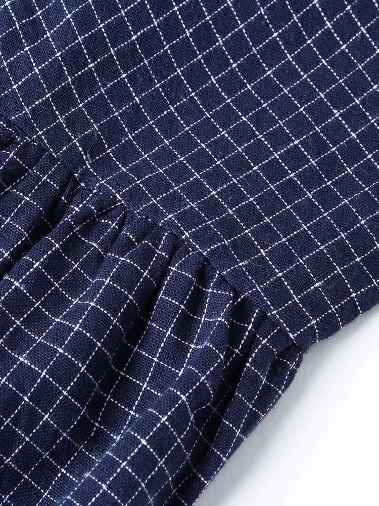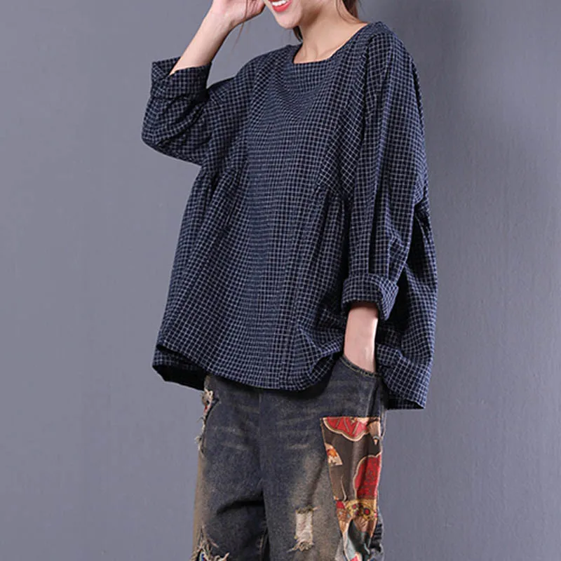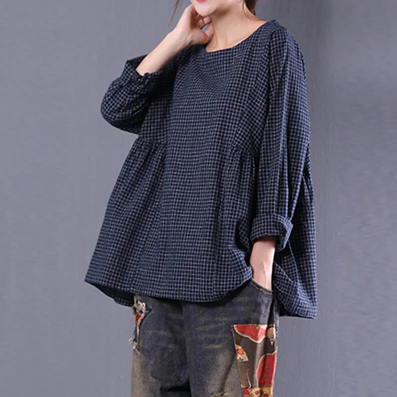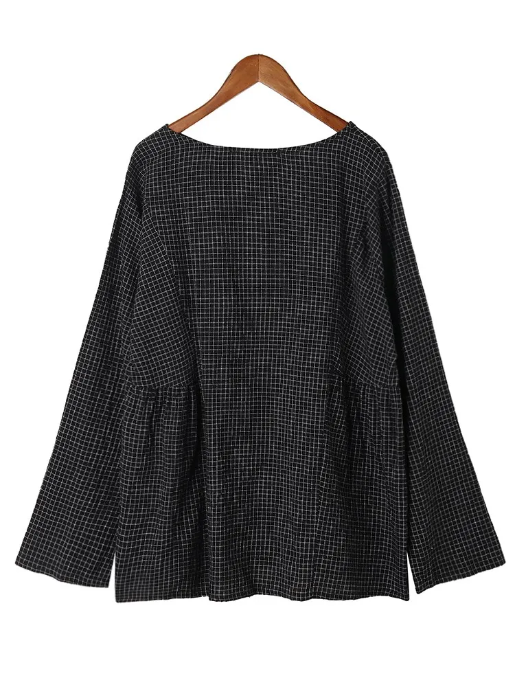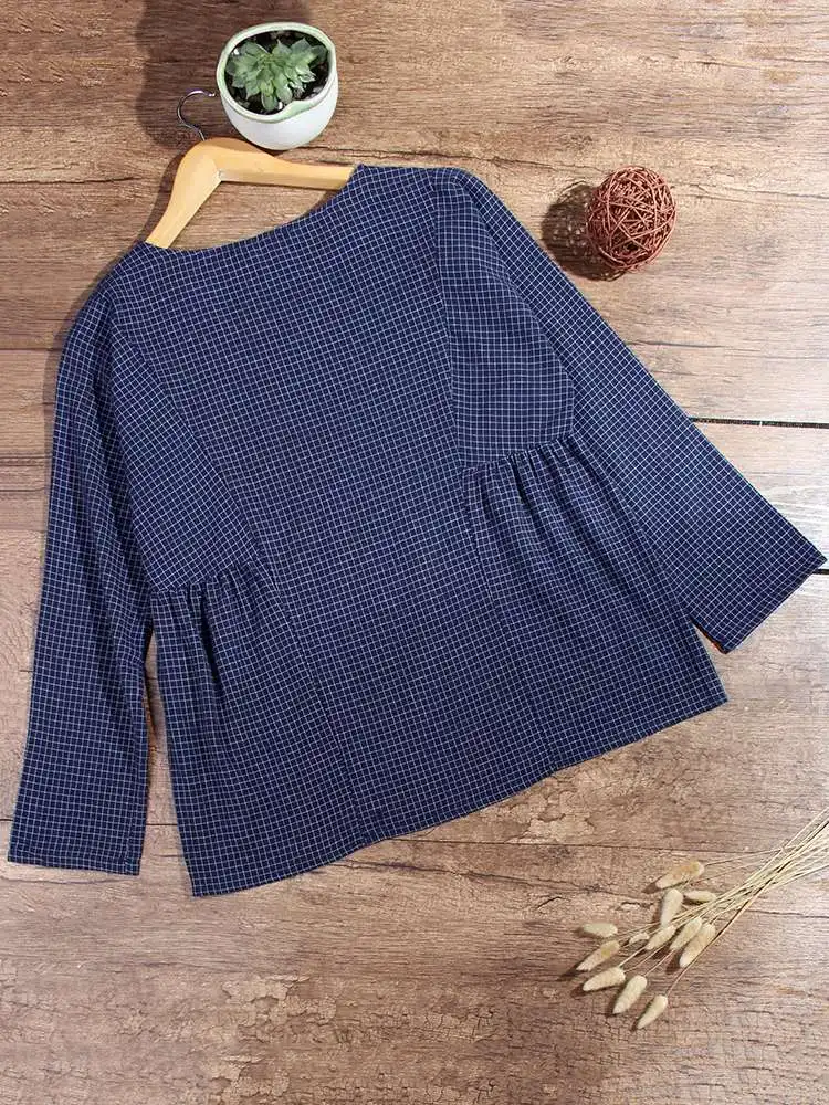 Top Blusas 2018 Women Crew Neck Long Sleeve Plaid Check Autumn Cotton Linen Casual Party Pleated Flounce Blouse Shirt Plus Size