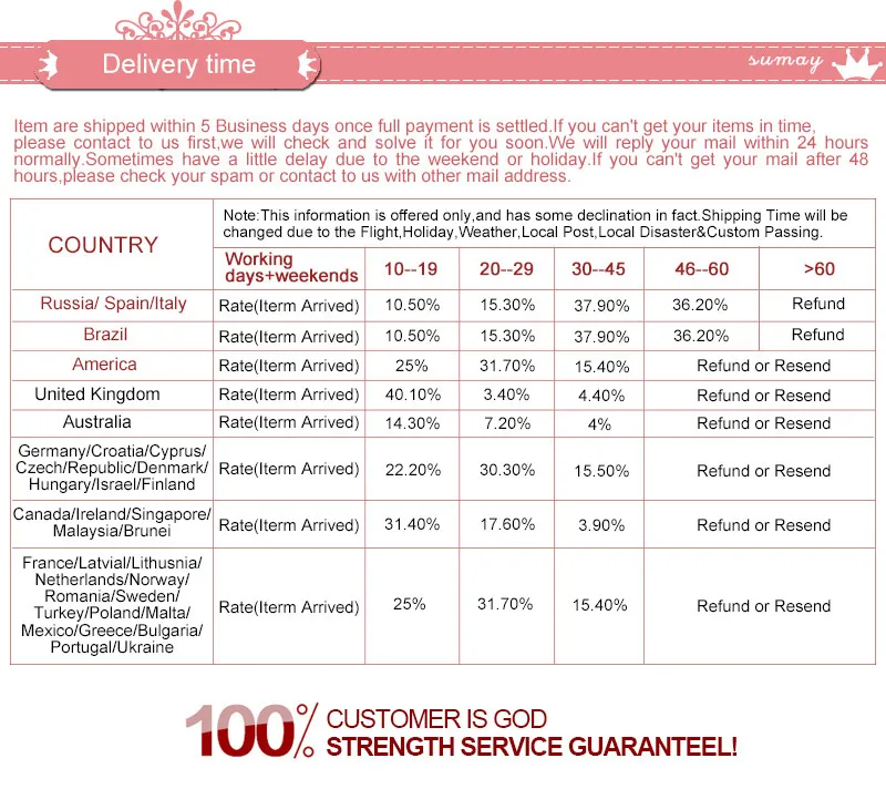 • If you did not receive the product within the guaranteed time( 45 days not including 2-5 day processing) you can request a refund or a reshipment.