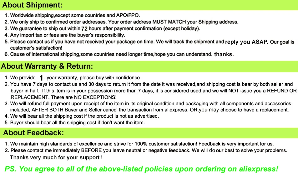 • If you did not receive the product within the guaranteed time( 45 days not including 2-5 day processing) you can request a refund or a reshipment.