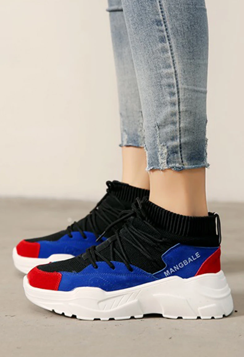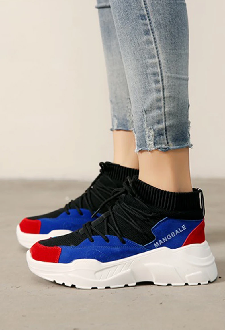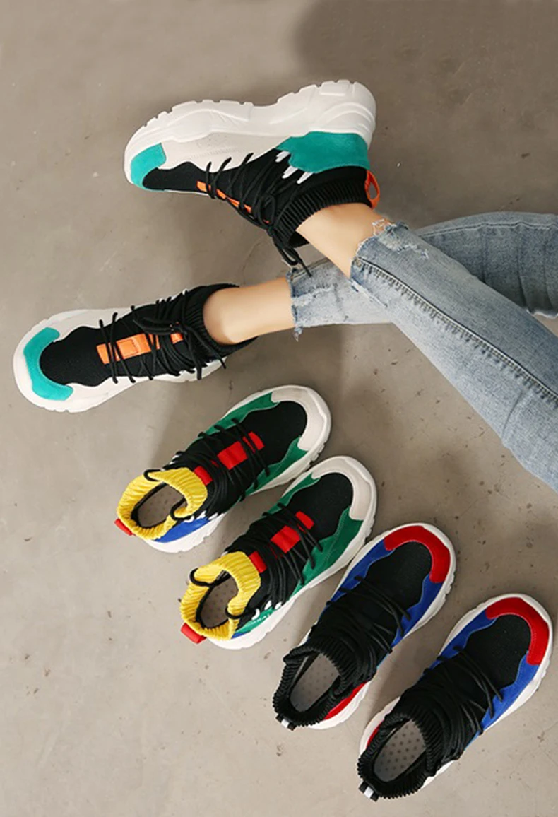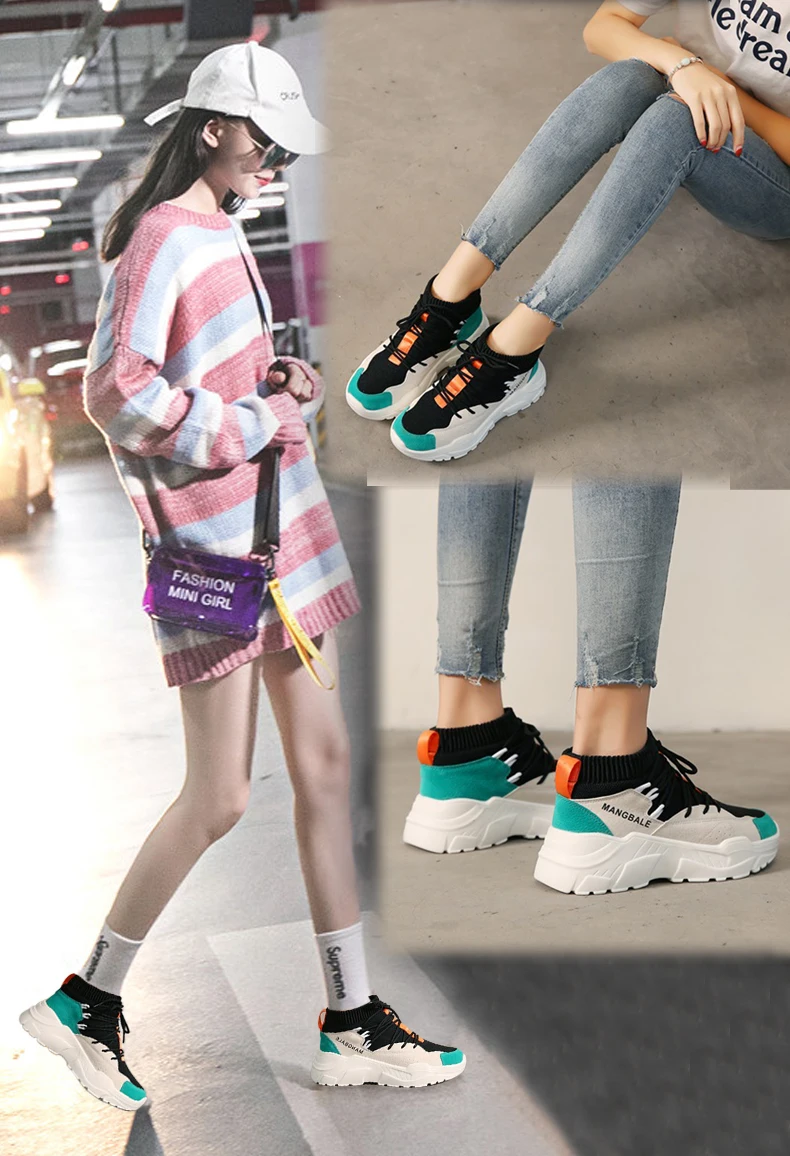 Top Quality Women Sock Sneakers Breathable Mesh Walking Shoes Lace up Woman Shoes Thicken Tranier High Top Black Female Shoe