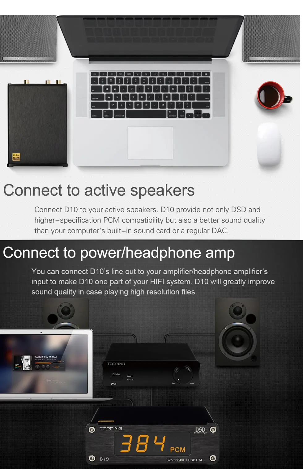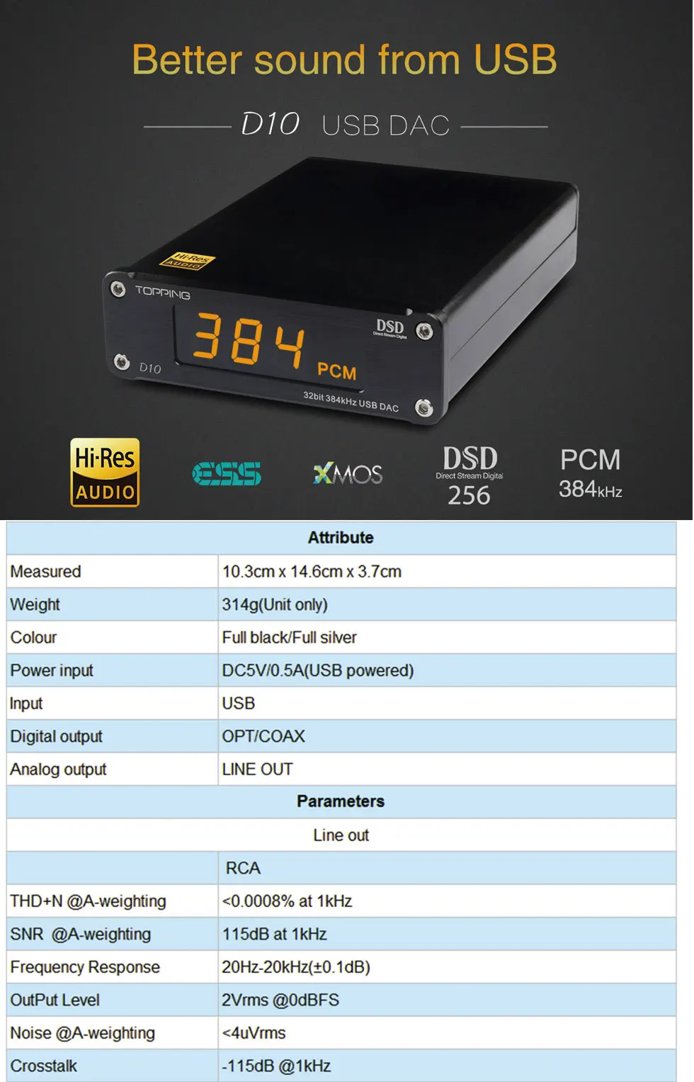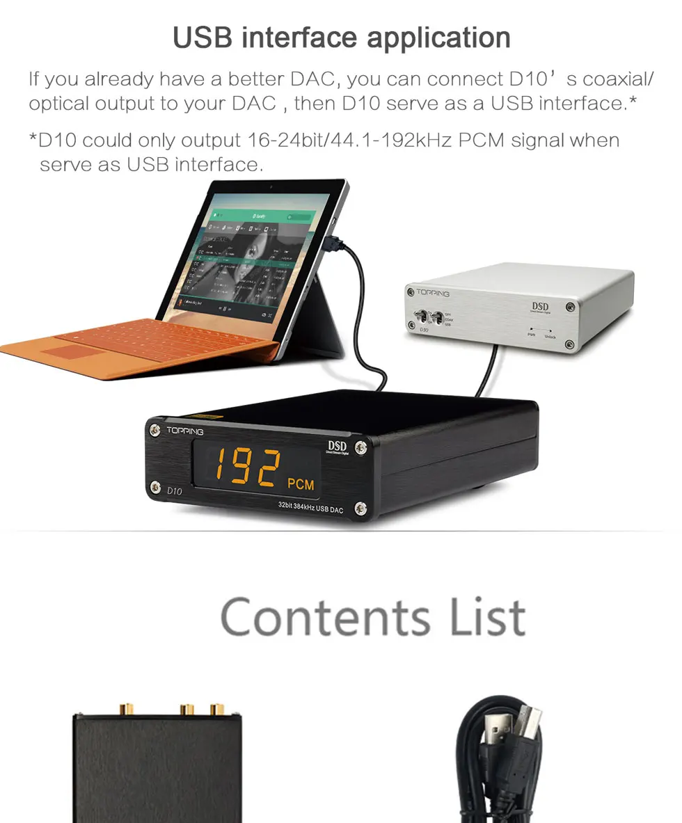 The DAC TOPPING D10 offers high quality manufacturing at a reasonable price. Based on proven circuit boards it provides a lot of music in a well finished compact aluminum case. It can also be used as a USB to SPDIF digital interface thanks to its two optical and coaxial outputs.