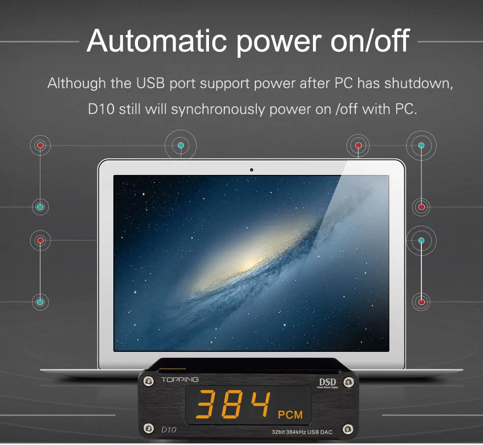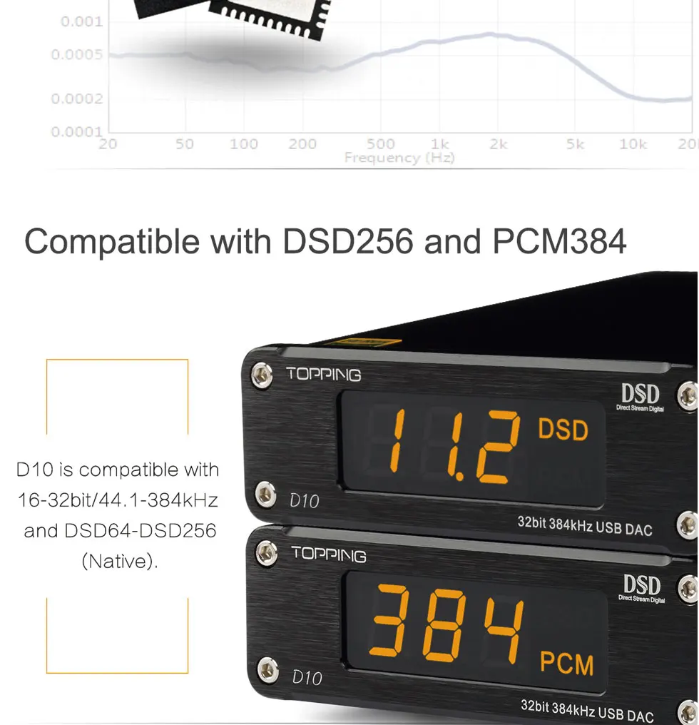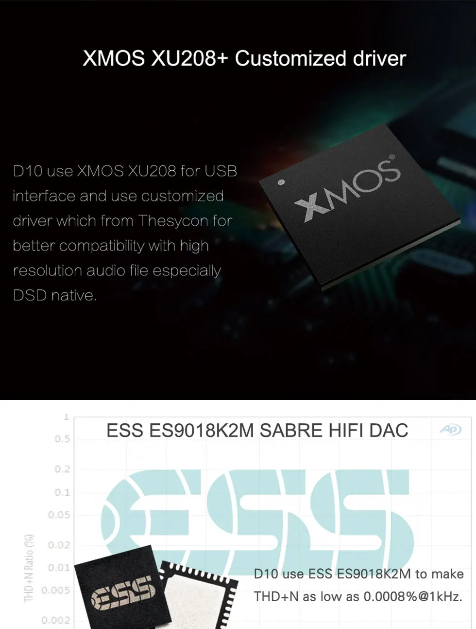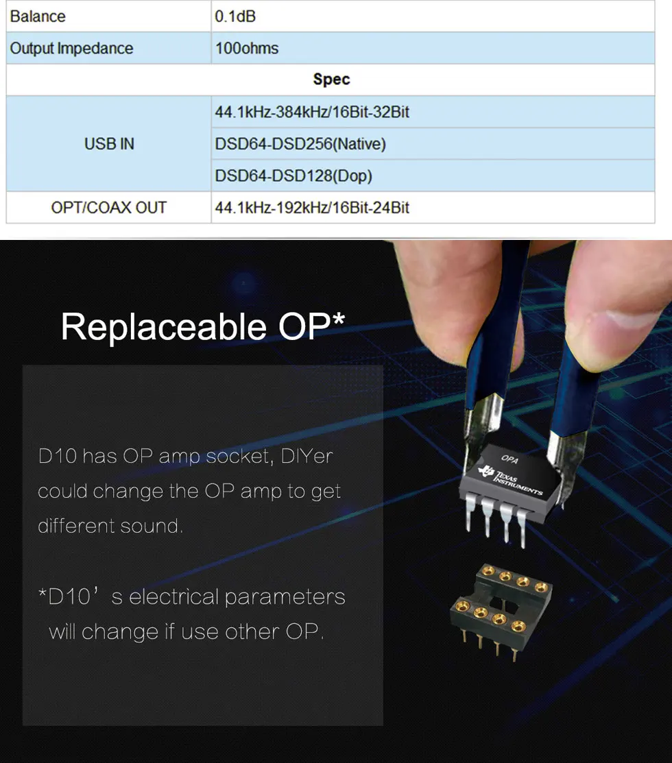 The D10 features premium components such as a USB XMos U208 USB input, a DAC Es9018K2M and OPA2134 stereo AOP TIs on interchangeable DIP 8 media. This DAC features THESYCON drivers optimized for Windows offering better native DSD compatibility, which makes it an obvious choice for lovers of High Definition.
