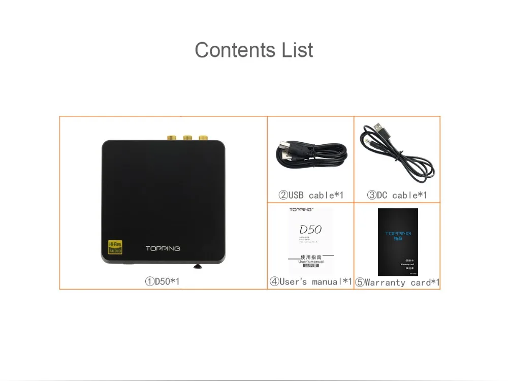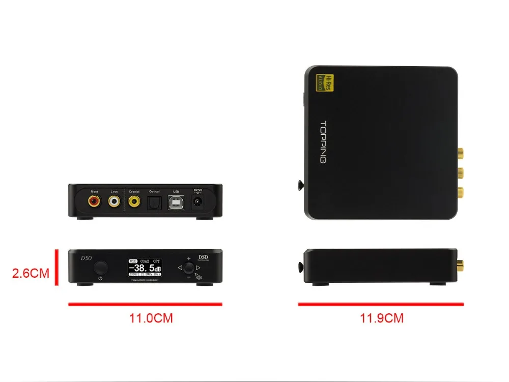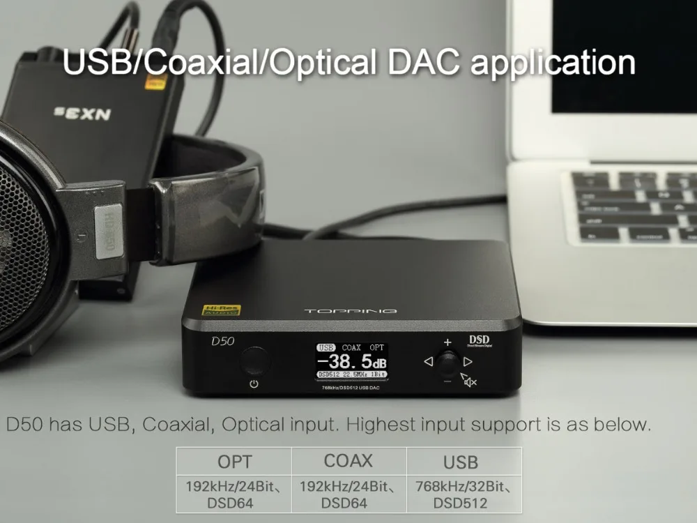 D50 use XMOS(XU208) + 2 x ES9038Q2M +3 x OPA1612 for DAC, in addition, D50 use customized drivers(Win 7 or above) from Thesycon, all these factors makes D50 support 32bit/768kHz and DSD512(Native) and all inputs can achieve DSD source input (coaxial and optical only support DSD64) and Auto on/off . Of course, D50 has Hi-Res Audio, CE, ROHS and FCC certificate.