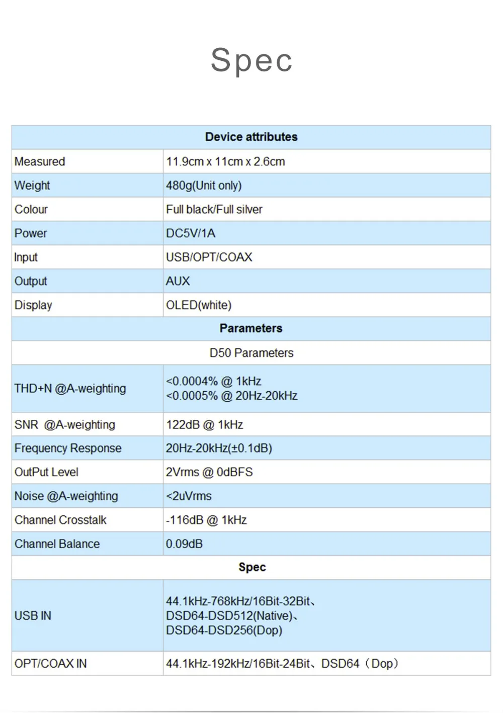 OPT/COAX IN : 44.1kHz-192kHz/16Bit-24Bit,DSD64(Dop)