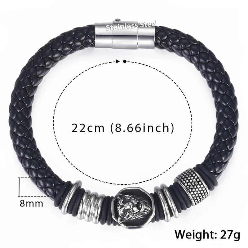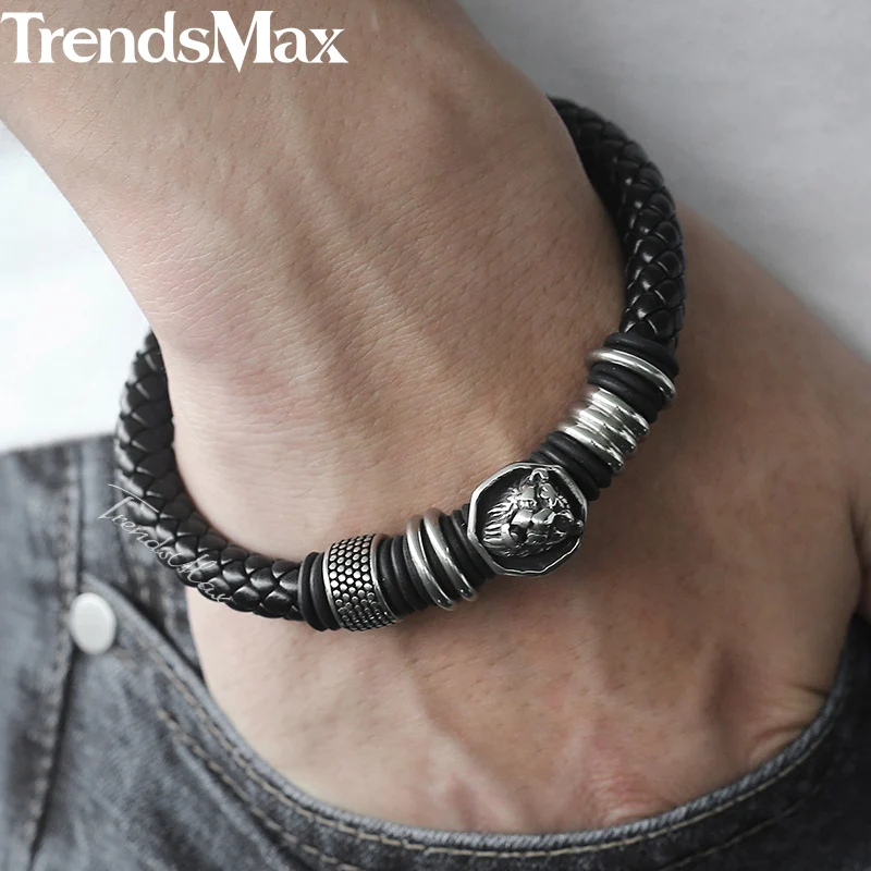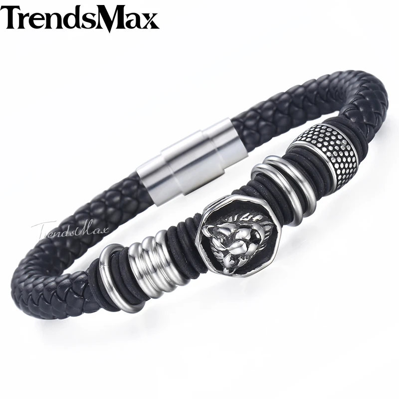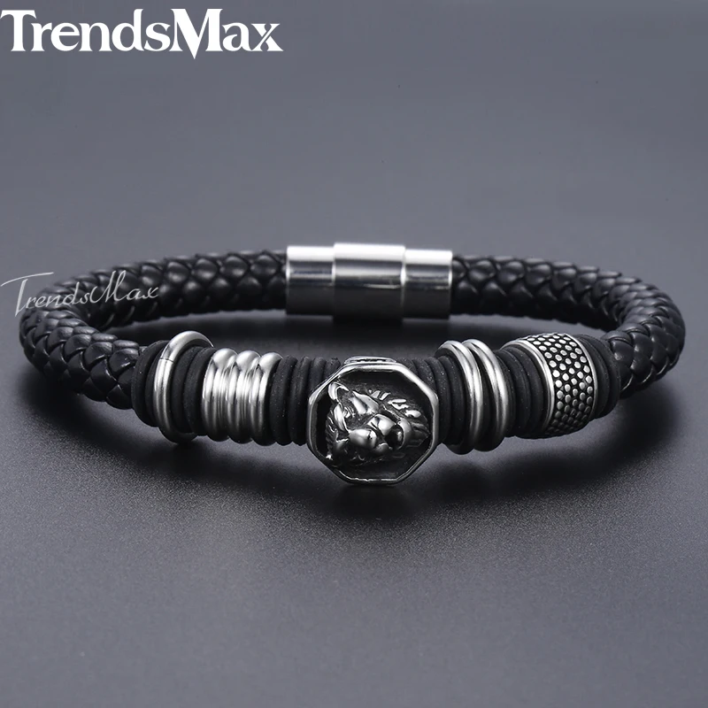 Trendsmax Men’s Black Leather Bracelet Punk Stainless Steel Leopard Head Charm Magnetic Clasp 8mm Dropshipping 2018 KDLB106