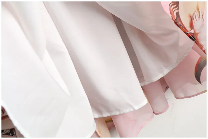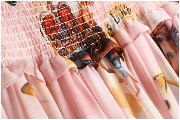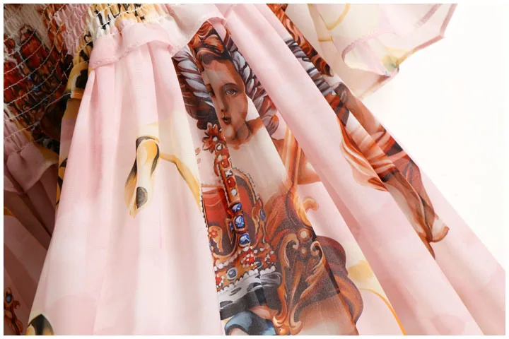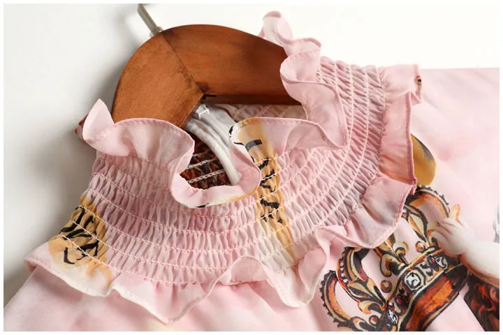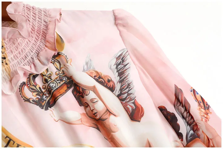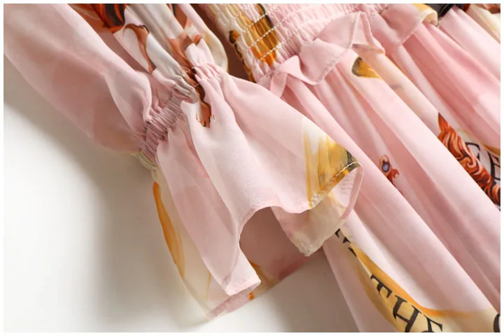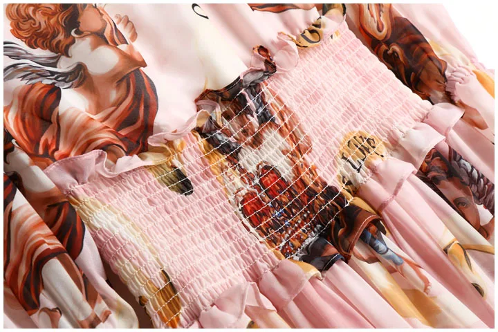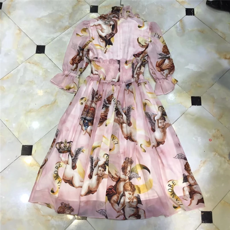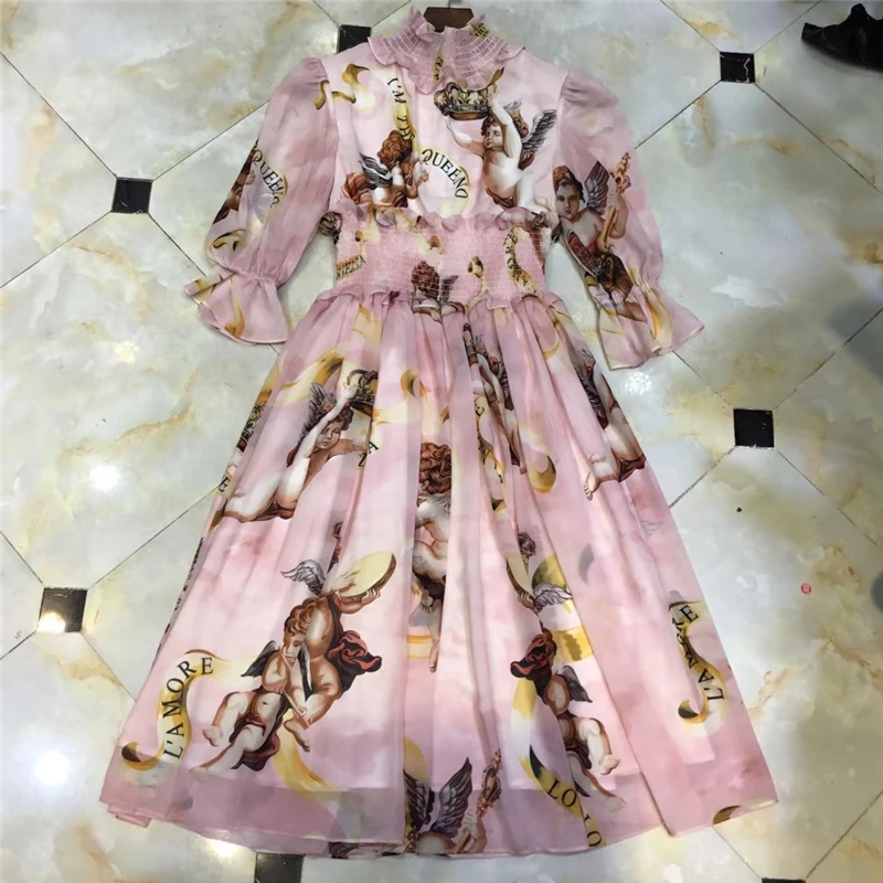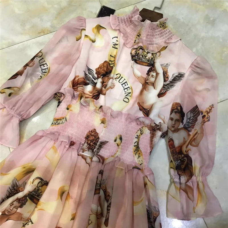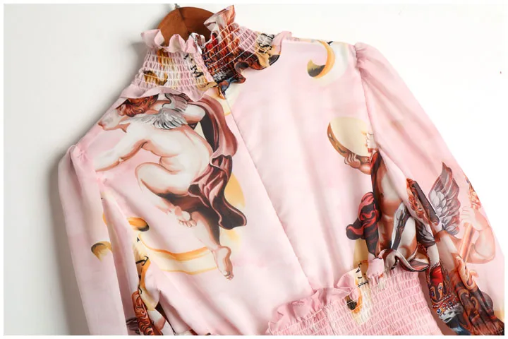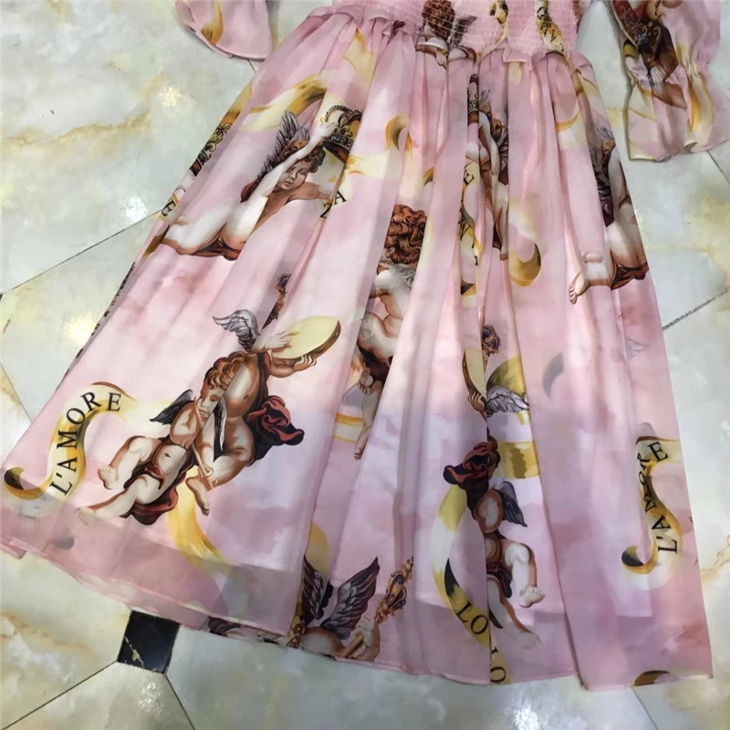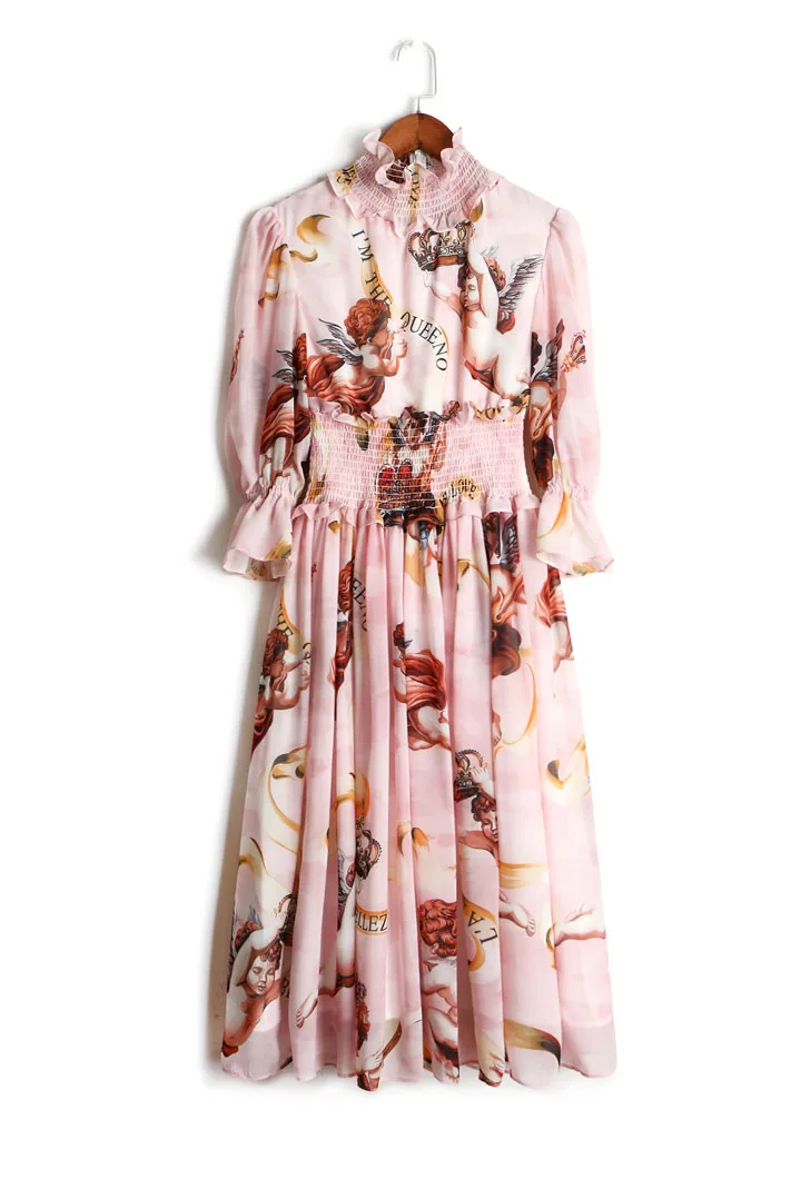 Truevoker Autumn Designer Vestido Women’s High Quality Puff Sleeve Cute Angle Printed Elastic Waist Pink Vestido