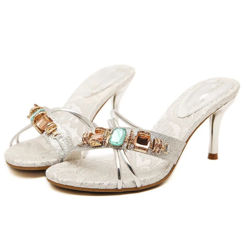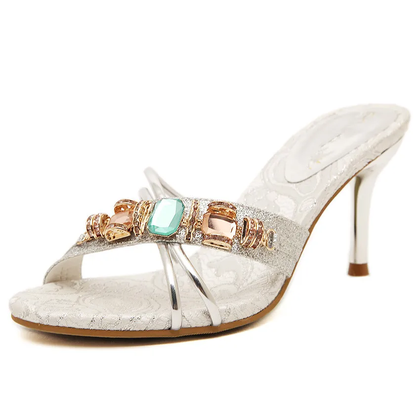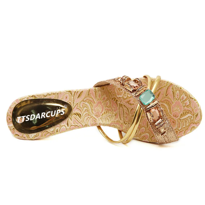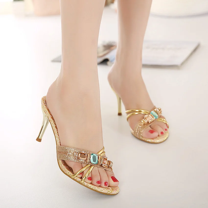 TTSDARCUPS High heel cool slippers Fine heel sandals Metal decoration of water drill Sexy night shop pump Rome women’s shoes