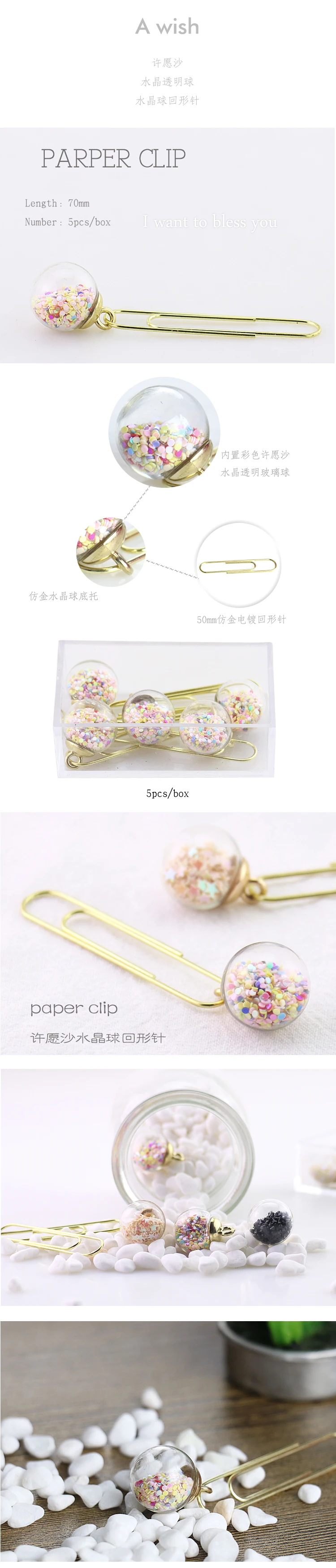 TUTU 5pcs/box Glass ball Paper Clips De Papel Notes DIY Bookmark Metal Binder Clips Fish Clips Notes Letter Paper Clips H0164