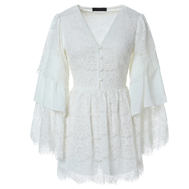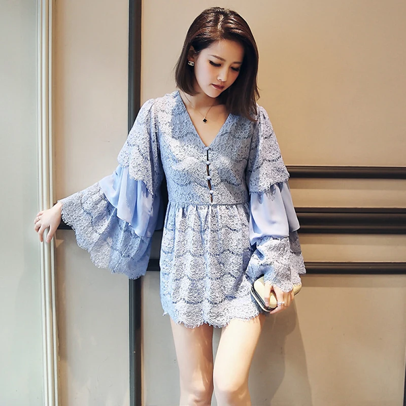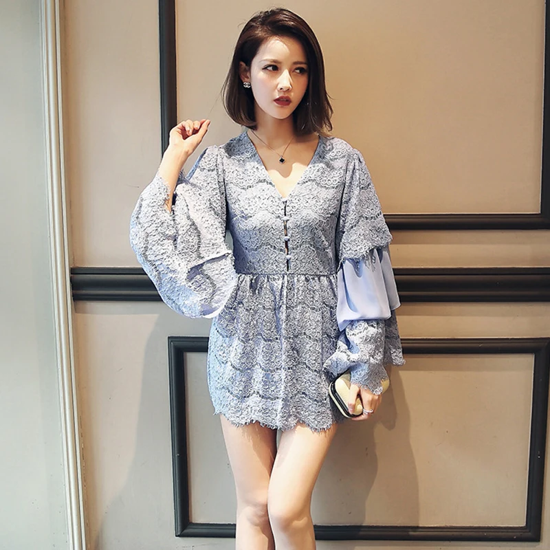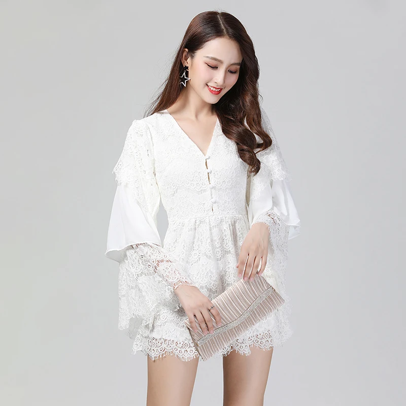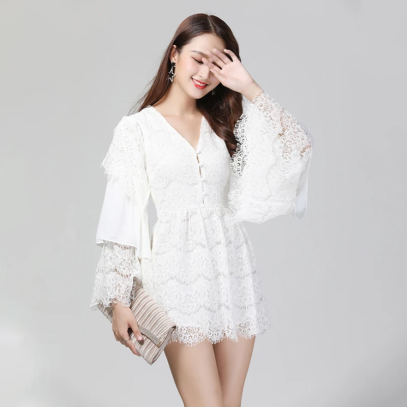 TWOTWINSTYLE Lace Playsuits For Womne Chiffon Patchwork V Neck Flare Sleeve Tunic High Waist Jumpsuit Short Rompers Summer Sweet