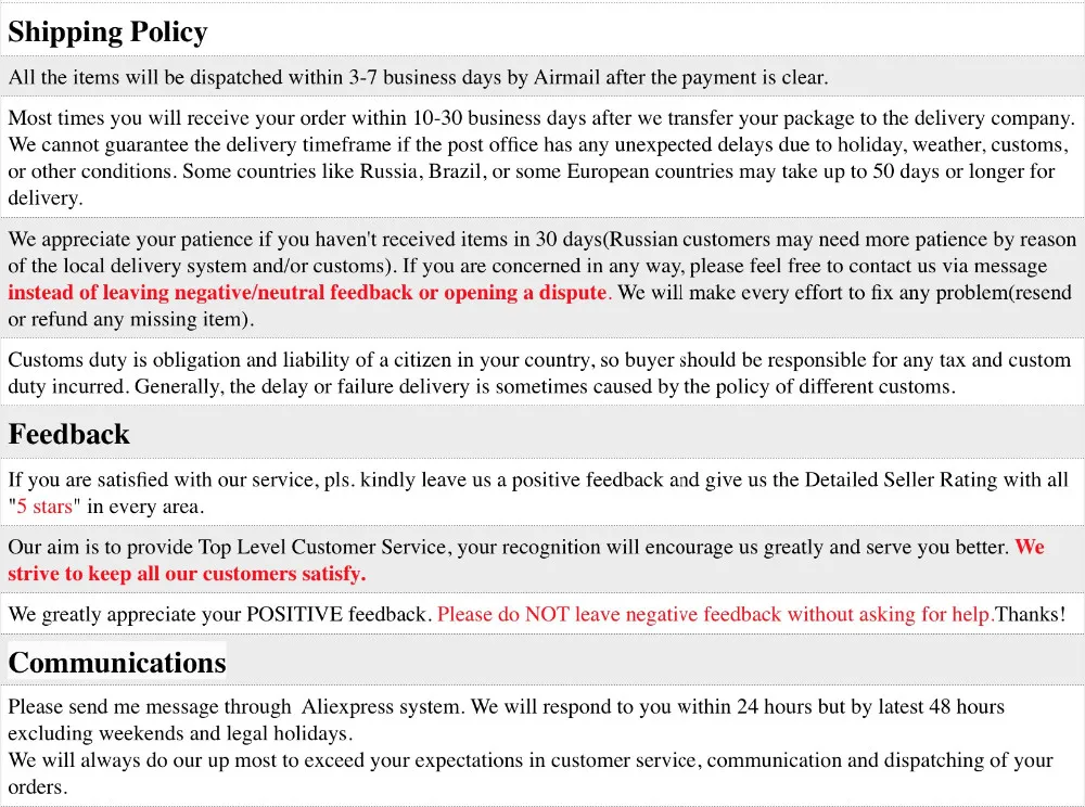 • If you did not receive the product within the guaranteed time( 45 days not including 2-5 day processing) you can request a refund or a reshipment.