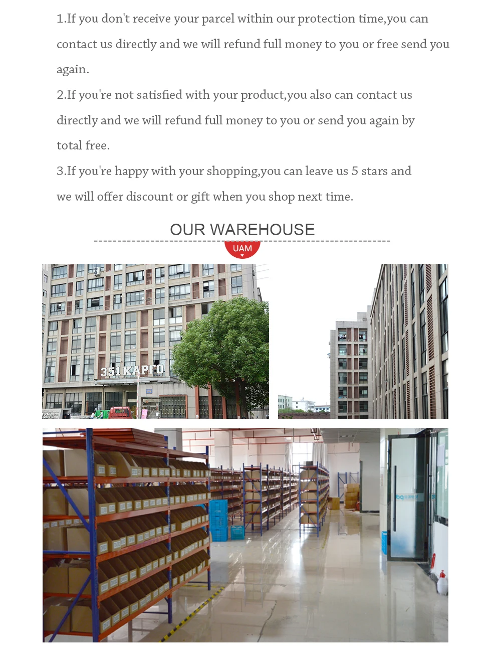 • If you did not receive the product within the guaranteed time( 45 days not including 2-5 day processing) you can request a refund or a reshipment.
