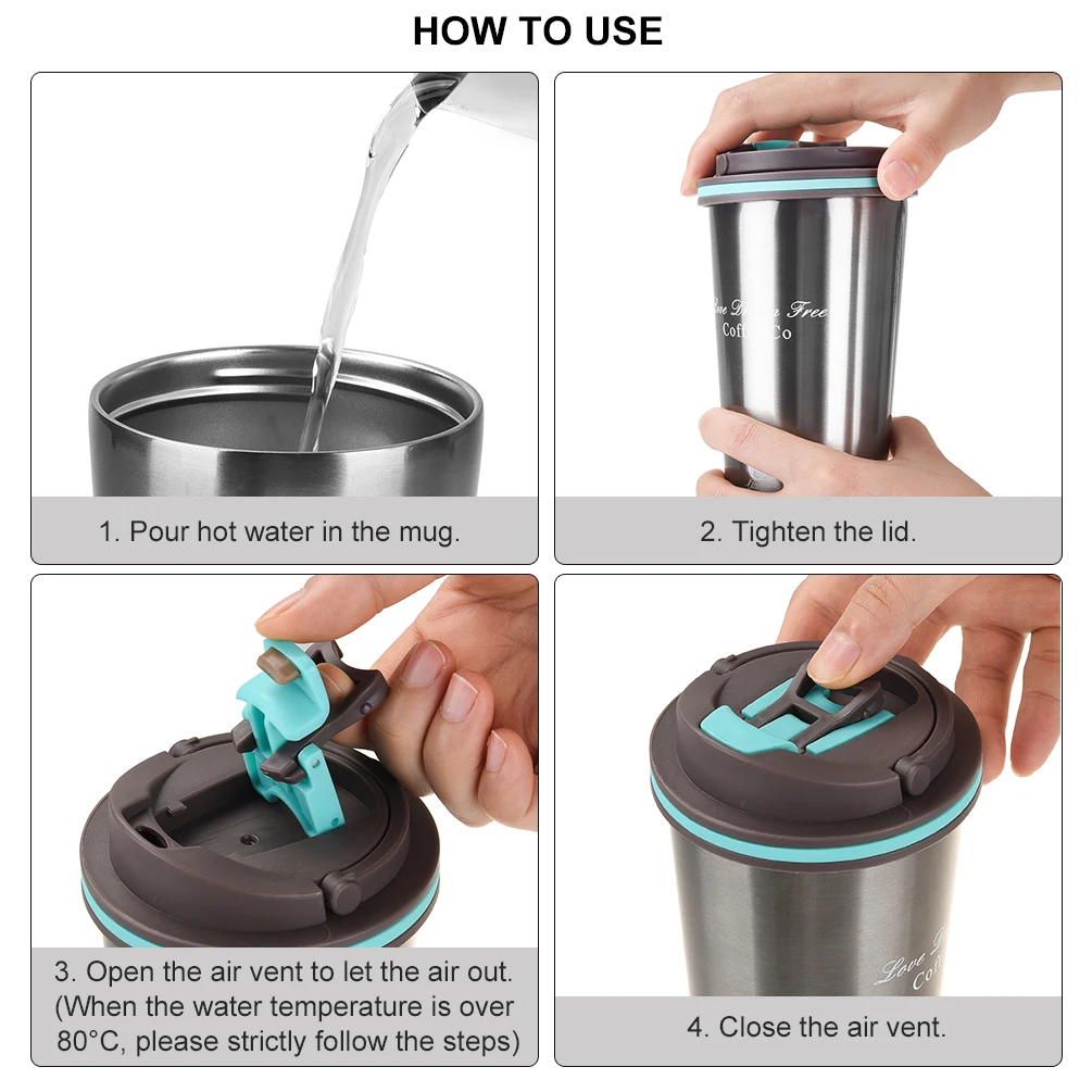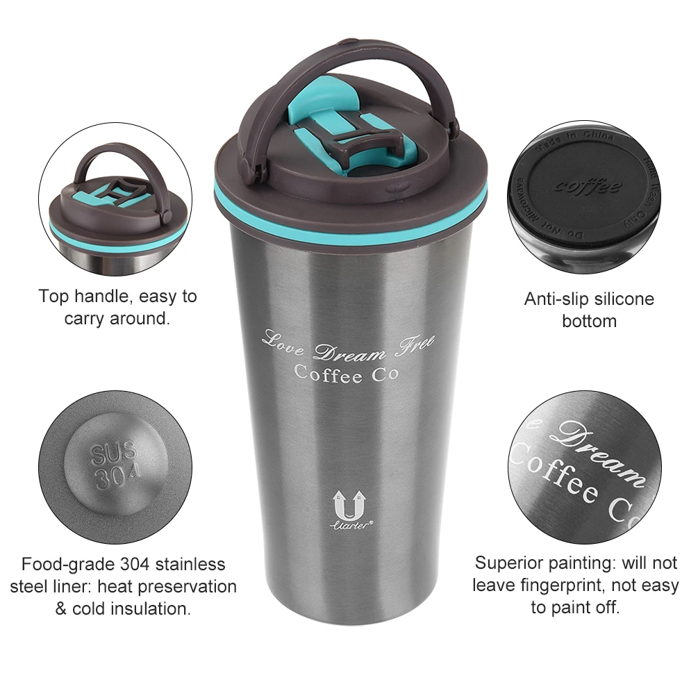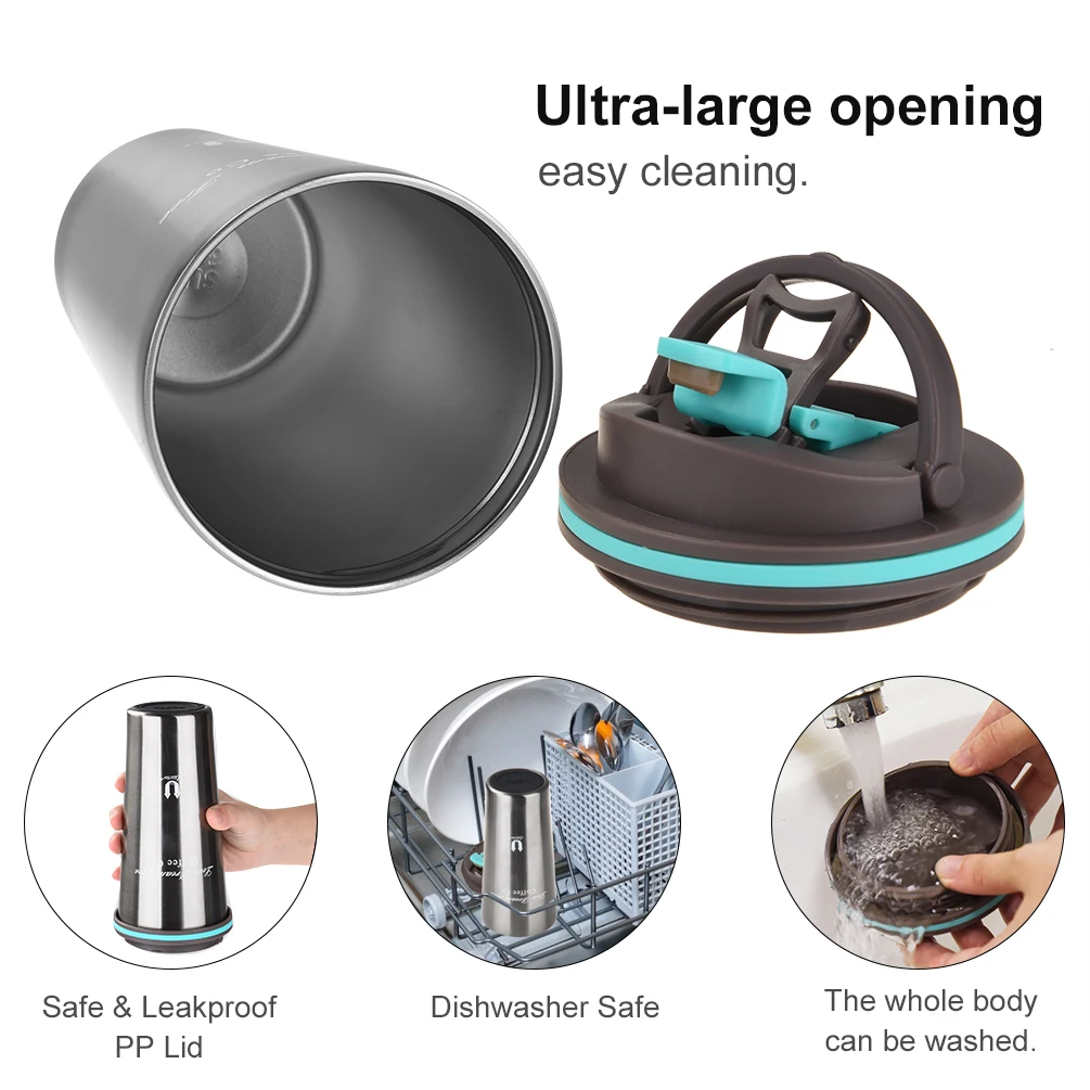 This coffee mug is made of food-grade stainless steel, which is equipped with double wall for good heat preservation and cold insulation. The mug has handy top handle that allows you to conveniently carry around. The lid is leakproof and the air vent is convenient and safe for venting, besides, the sipping opening is good for drinking.