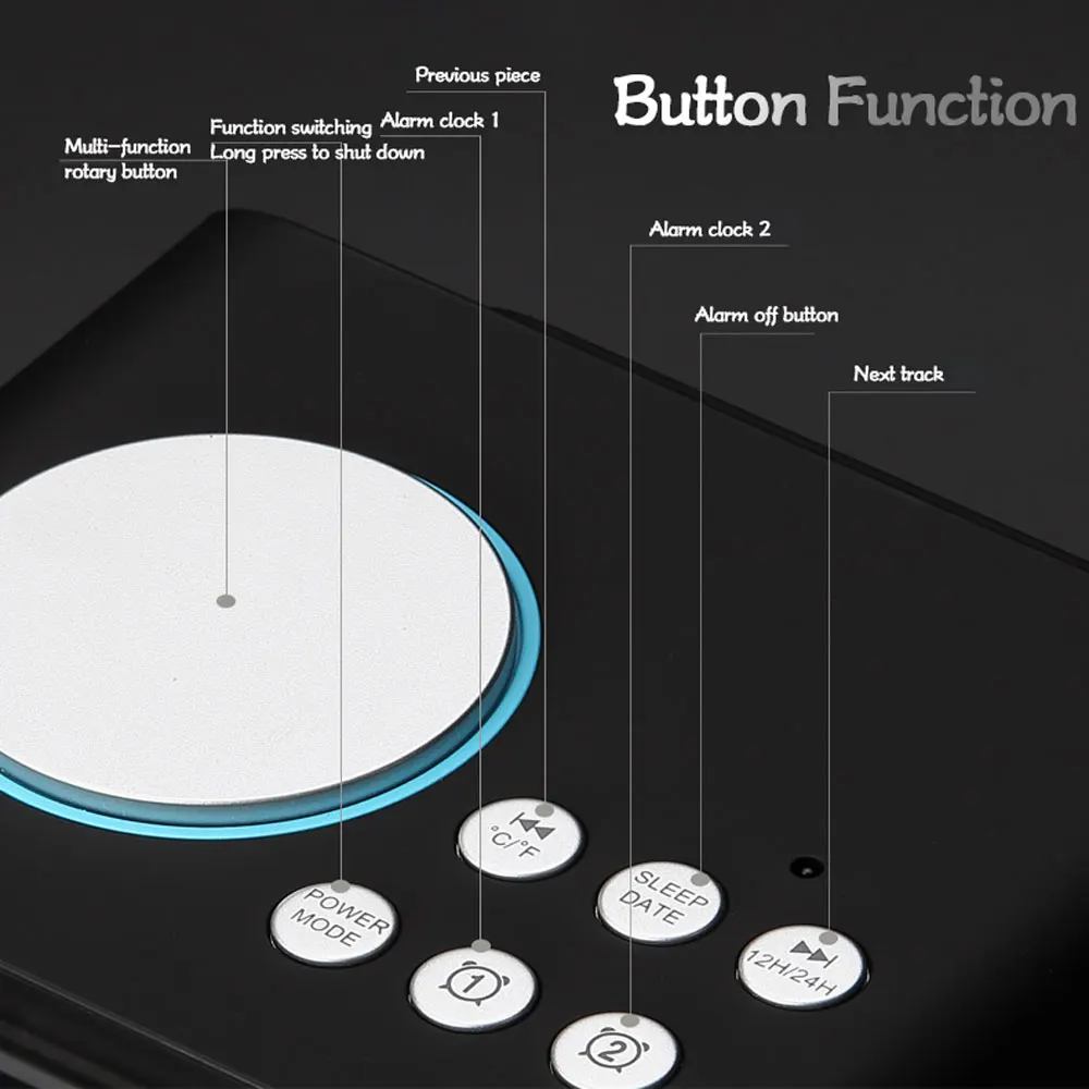 3. Adjustable Clock: 12H/24H Switch, snooze functions, you can setup two different wake up time with either alarm ringtone or FM radio. The alarm volume can be adjusted by rotate the rotary button, suitable for heavy sleepers and light sleepers.