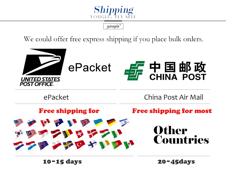 Packages from our warehouse in China will be shipped by ePacket or EMS depending on the weight and size of the product. Packages shipped from our US warehouse are shipped through USPS.