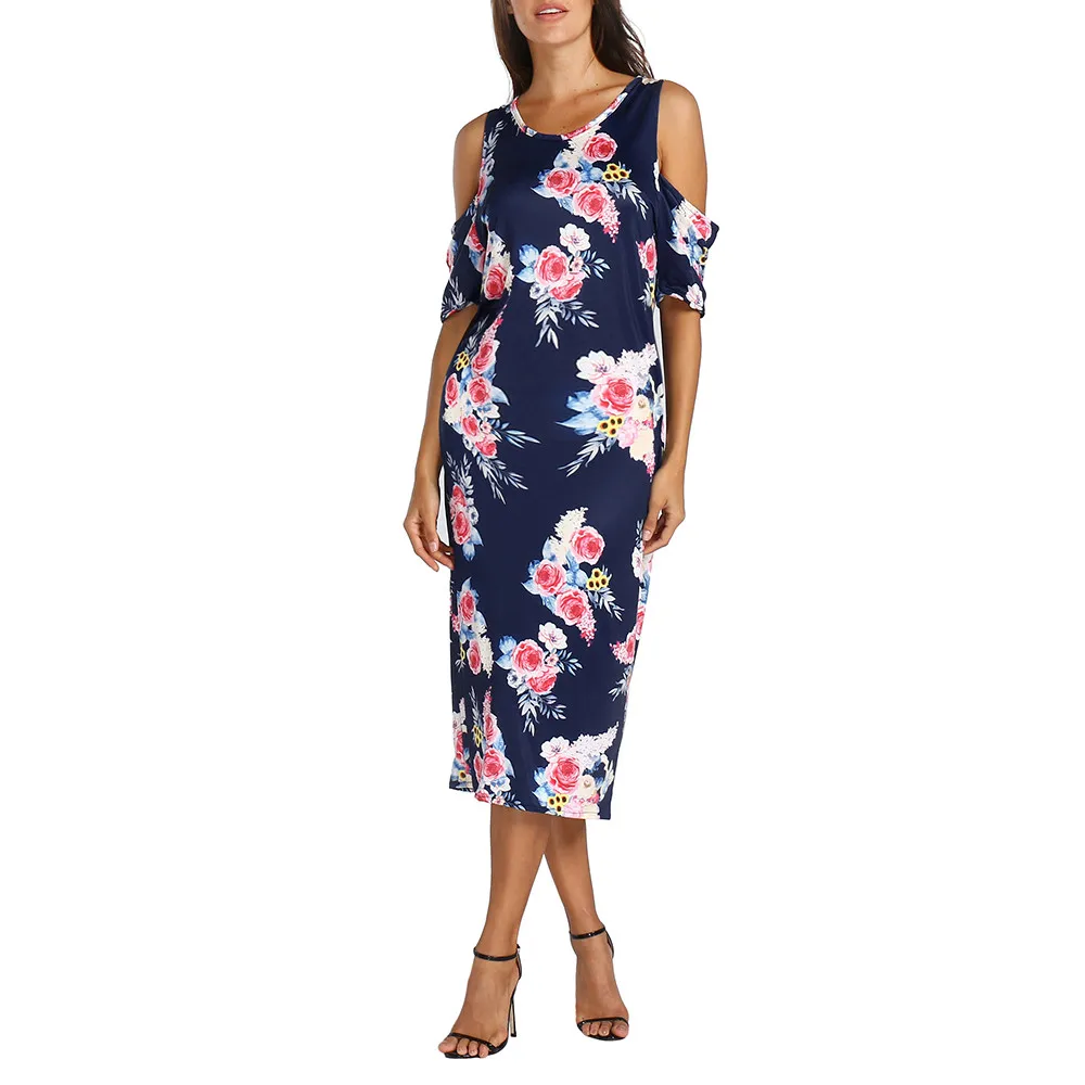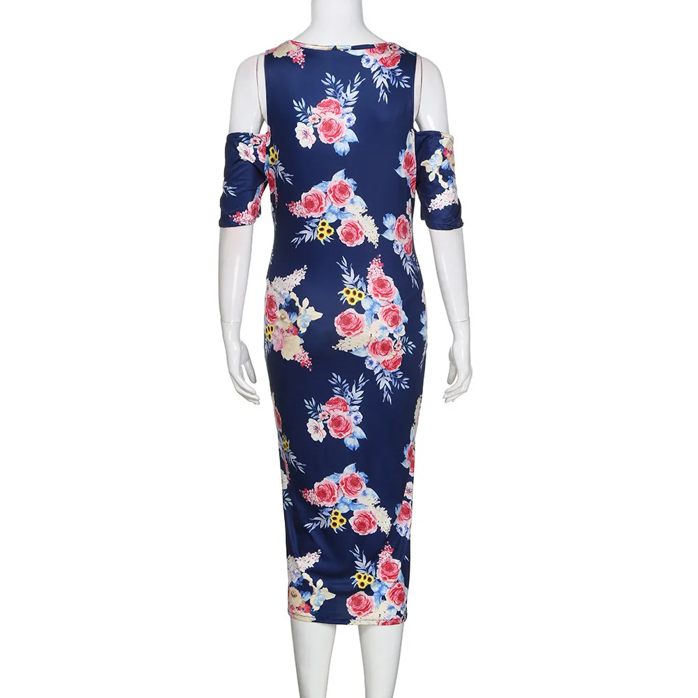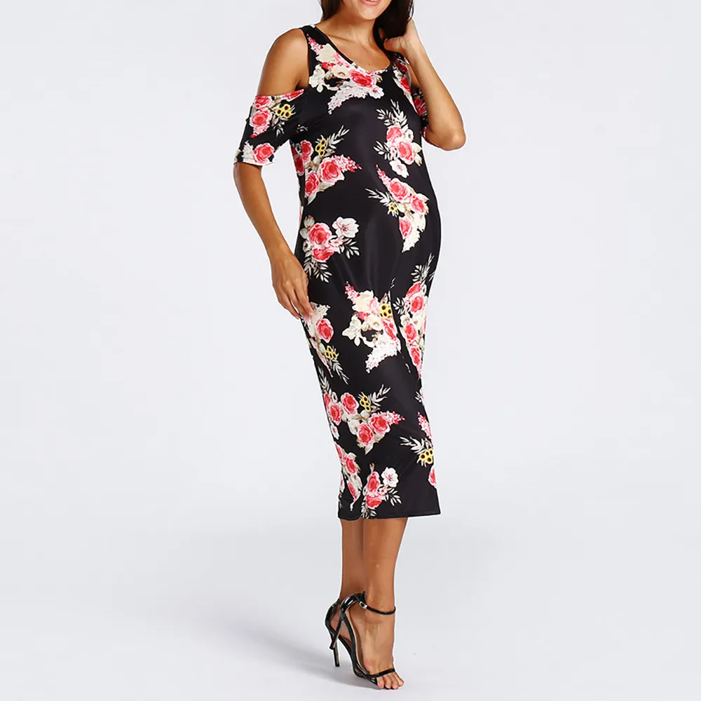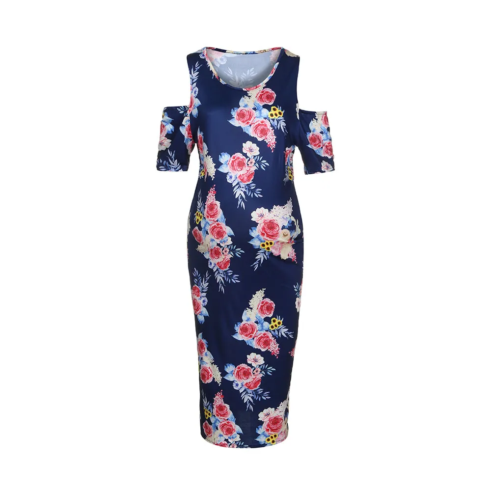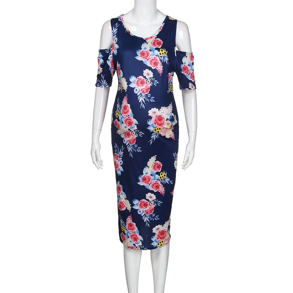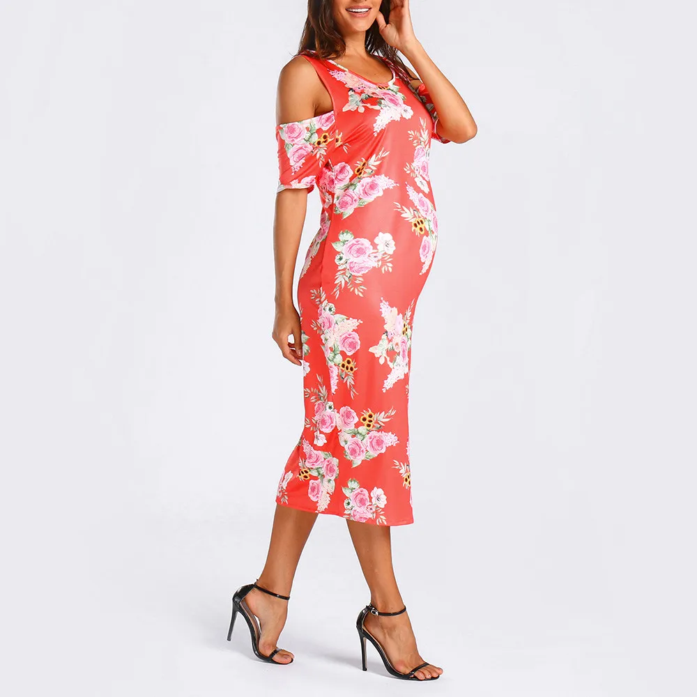 ummer Sexy Maternity Clothing Dress Mother Women Floral Print Cold Shoulder Body-Con Short Sleeve Dress Pregnant Woman Dress