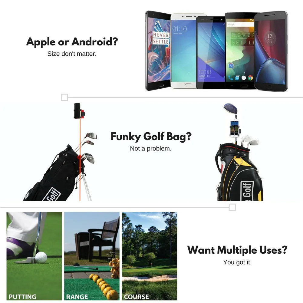 The best golf equipment, adapt to all smartphone sizes and improve your golf swing! Suitable for all types of golf bags (bracket bag and cylinder bag), quick to install and take off, suitable for all standard club, directional sticks, able to shoot and capture each swing (without shaking), teach through lively activities, easy to play back every swing action for correcting wrong posture and improving swing quality!