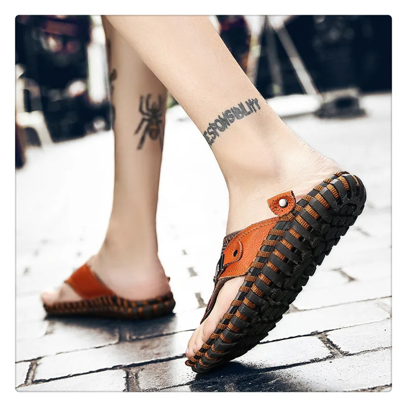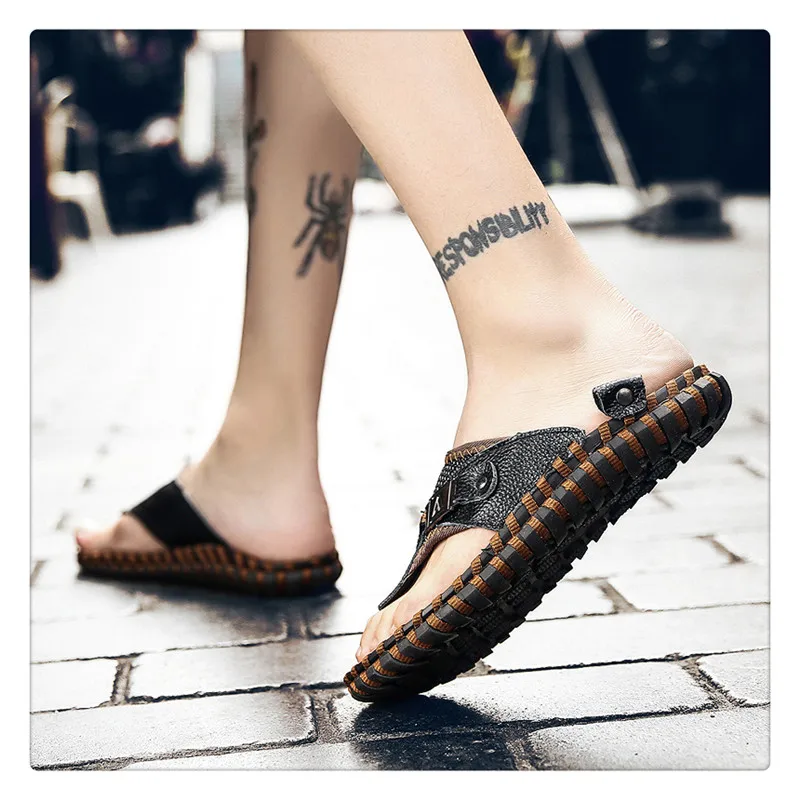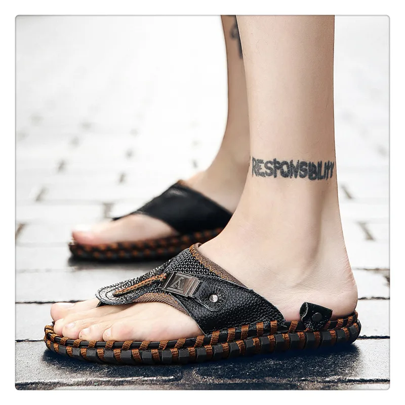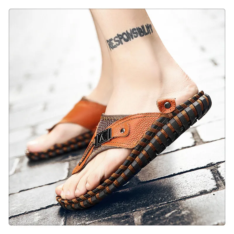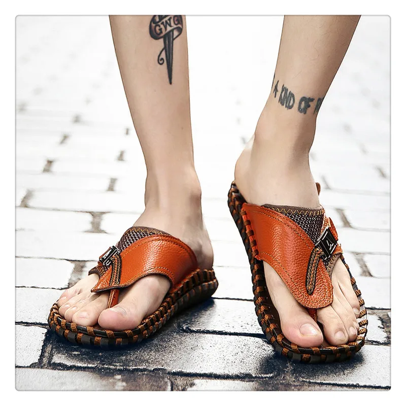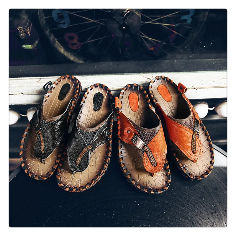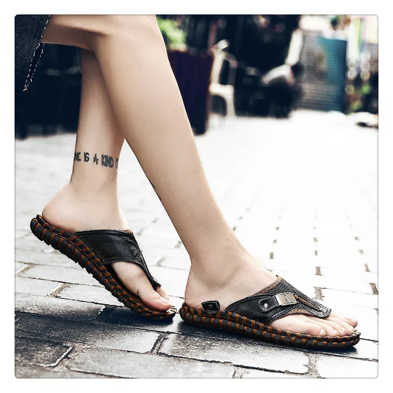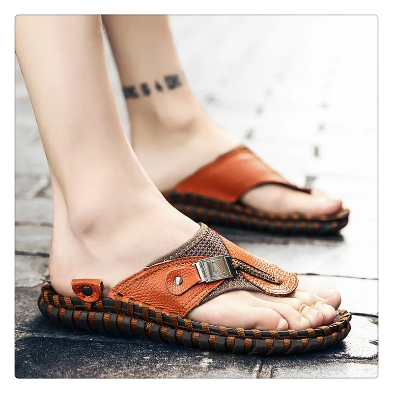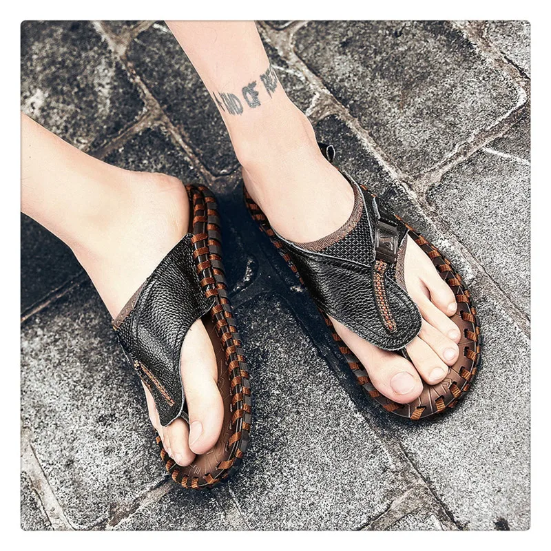 URBANFIND New Men Leather Slippers Summer Sandals Shoes Plus Size 38-48 Sewing Design Male Casual Flip Flops Black Brown Colors