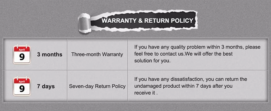 • If you did not receive the product within the guaranteed time( 45 days not including 2-5 day processing) you can request a refund or a reshipment.