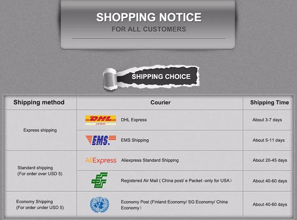 Packages from our warehouse in China will be shipped by ePacket or EMS depending on the weight and size of the product. Packages shipped from our US warehouse are shipped through USPS.