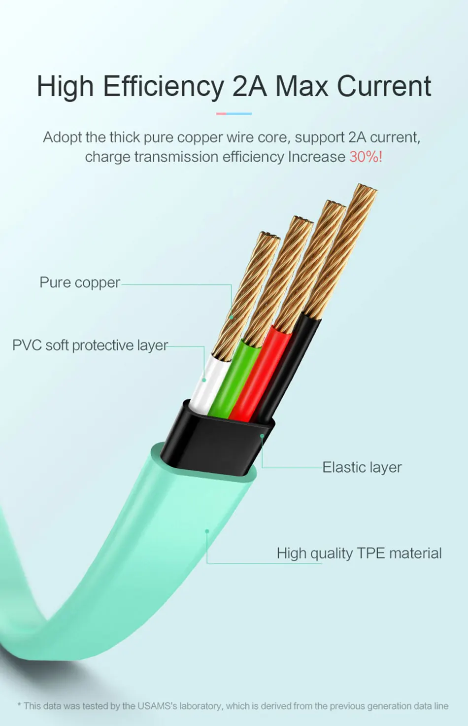 Adopt the thick pure copper wire core,support 2A charge, increase 30% speed