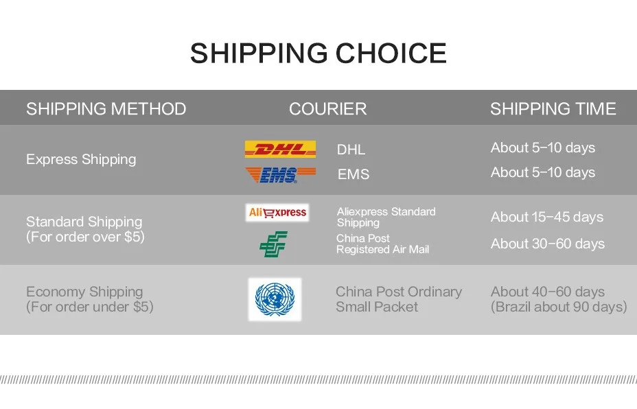 Packages from our warehouse in China will be shipped by ePacket or EMS depending on the weight and size of the product. Packages shipped from our US warehouse are shipped through USPS.