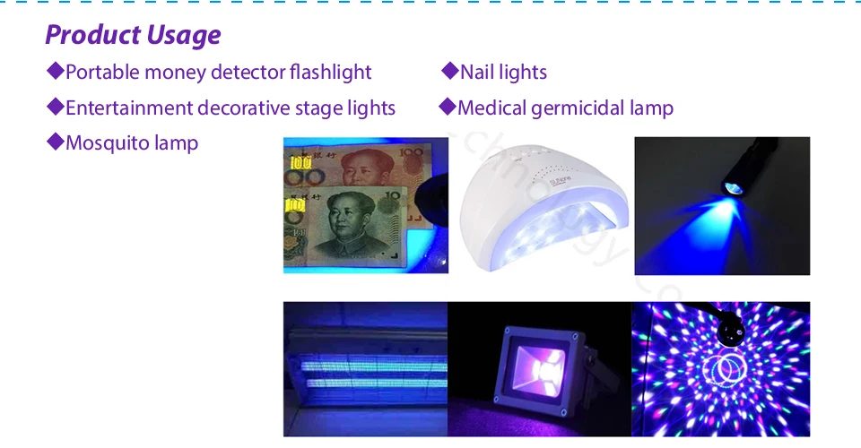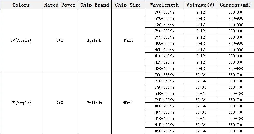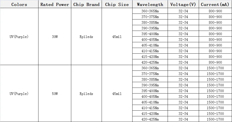- Chip Wavelength: 365Nm/375Nm/385Nm/395Nm/405Nm/410Nm/415Nm/420Nm/425Nm