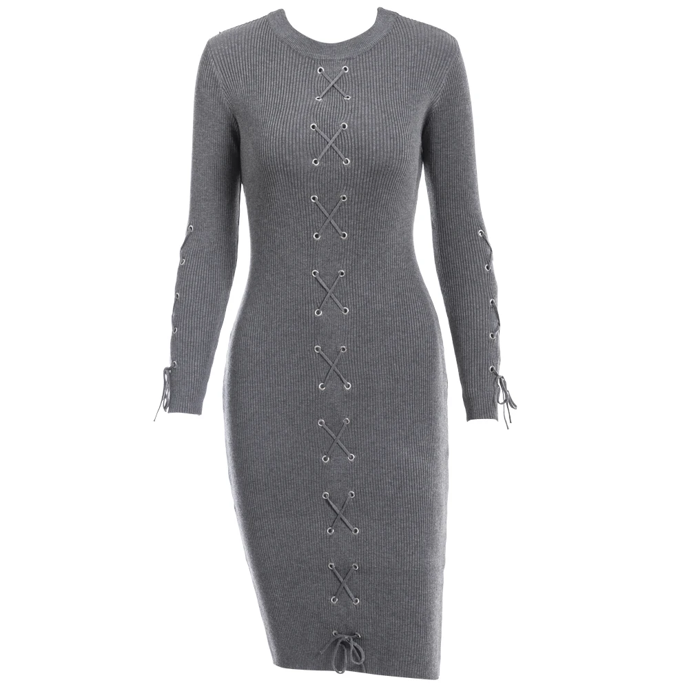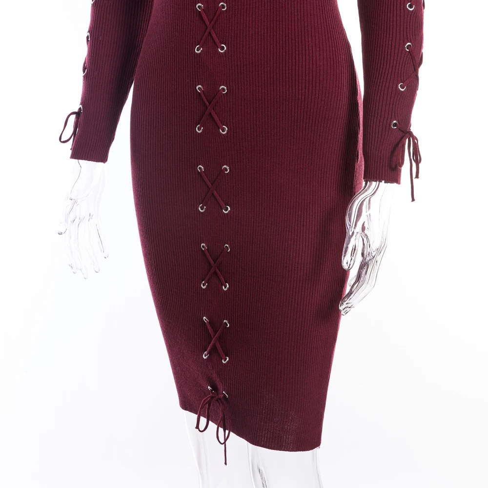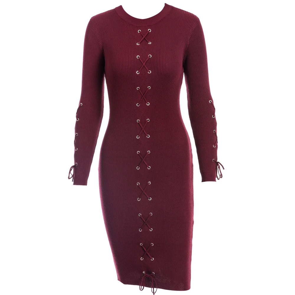 VEEGGI Autumn Winter Women Party Sheath Wrap Bandage Dresses Long Sleeve O-Neck Sexy Knitted Midi Dress Female 1807020
