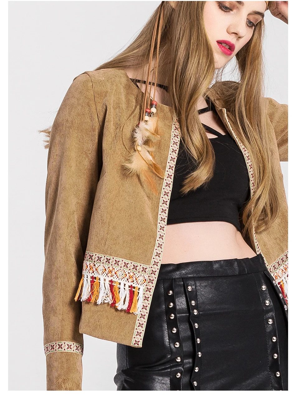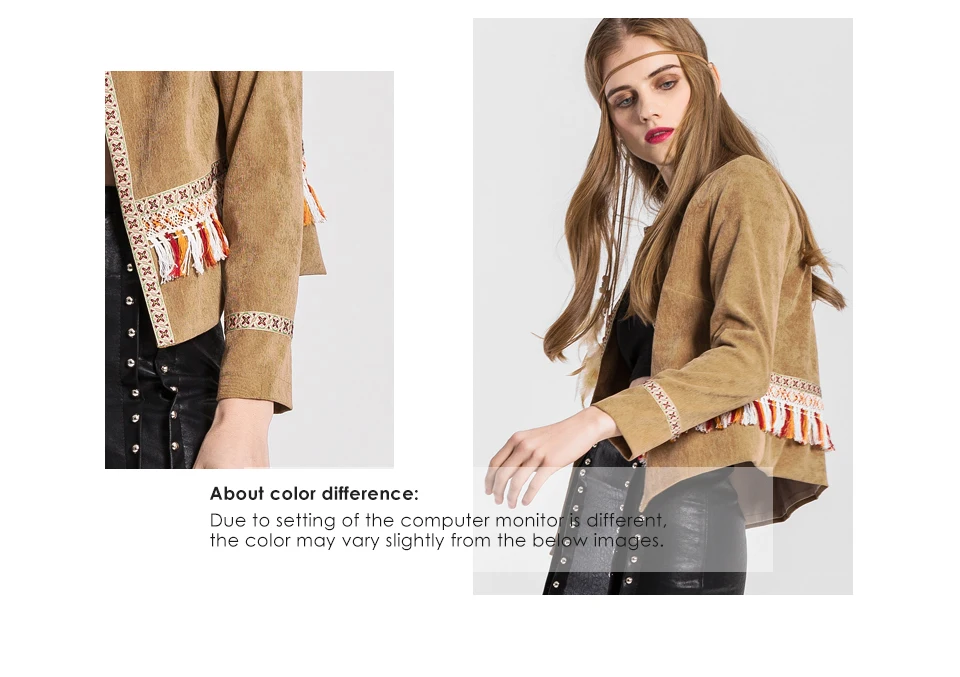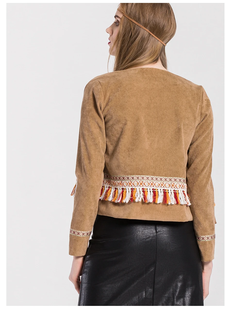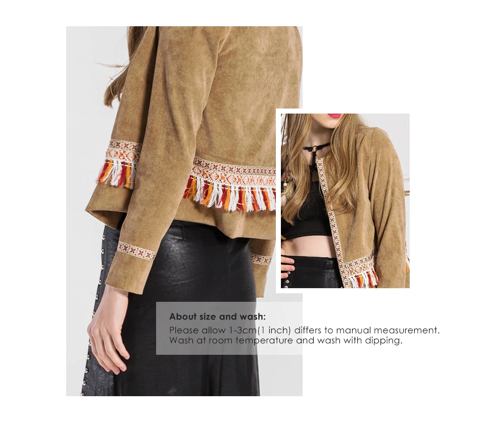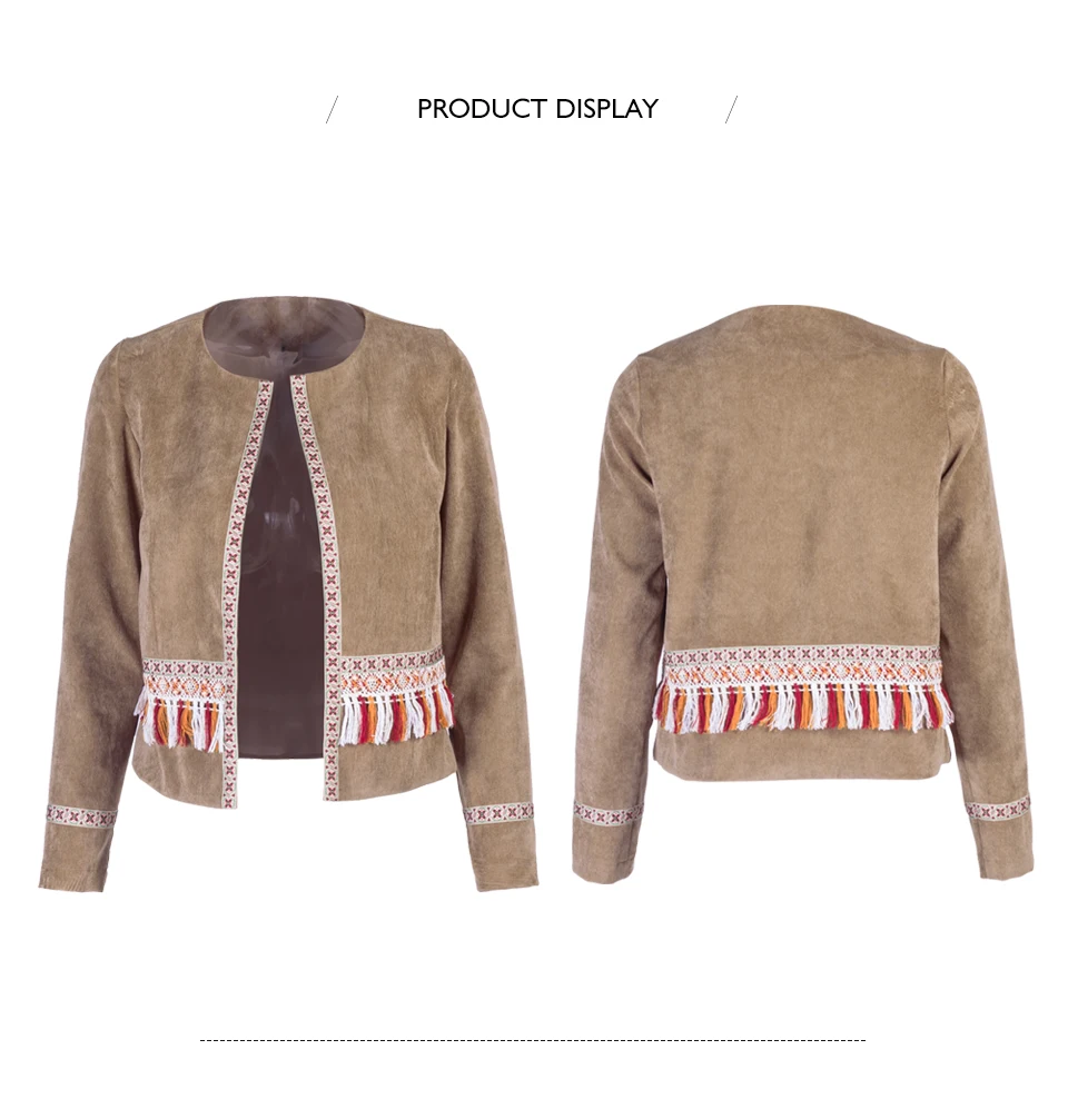 VEEGGI Women Bohemian Vintage Jackets New Arrival Boho Style Tassel Print Open Stitch O-Neck Long Sleeve Short Coats