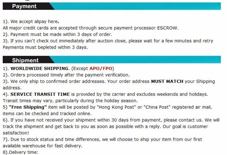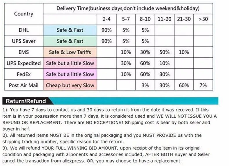 • If you did not receive the product within the guaranteed time( 45 days not including 2-5 day processing) you can request a refund or a reshipment.