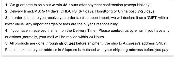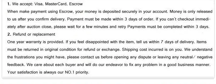 • If you did not receive the product within the guaranteed time( 45 days not including 2-5 day processing) you can request a refund or a reshipment.