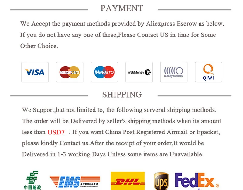 Packages from our warehouse in China will be shipped by ePacket or EMS depending on the weight and size of the product. Packages shipped from our US warehouse are shipped through USPS.