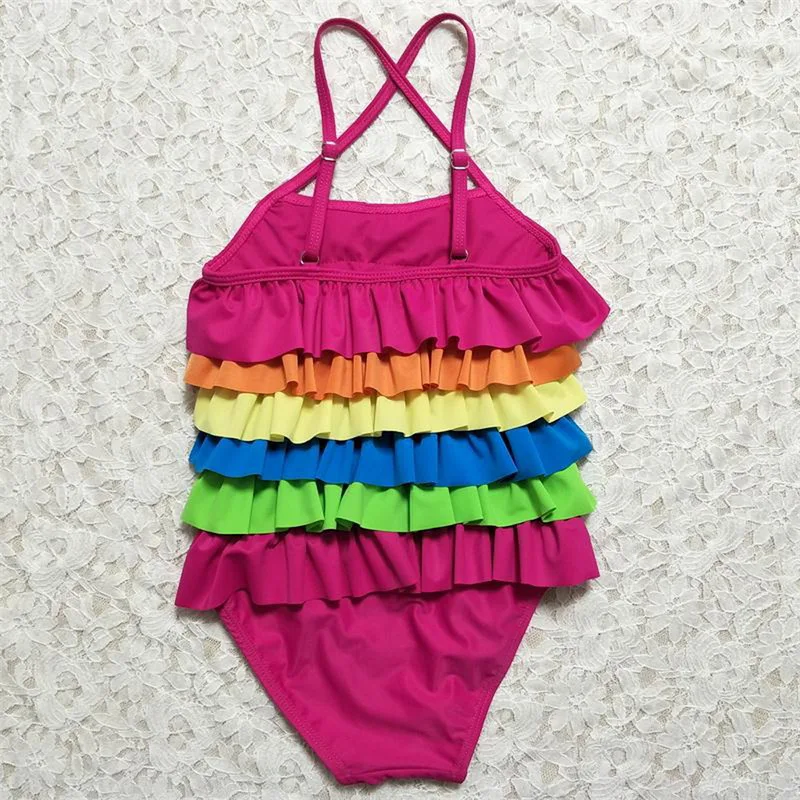 Vertvie 2018 New Layered Dress Girls Bandage Bodysuit Summer Beachwear Baby Rainbow Bikinis Ruffle Swimwear Cute Kids One-pieces