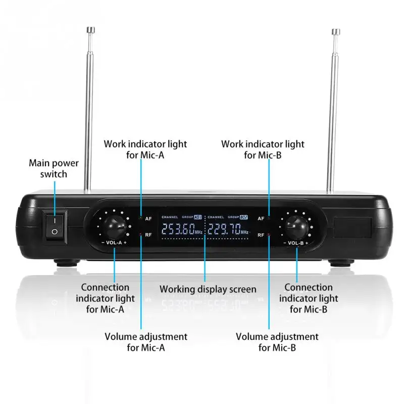 Are you looking for a twin VHF wireless microphone system for karaoke? Does you annoy at messy cables or the limitation of the cable distance? Now our wireless microphones have the solution! No matter you are a DJ or a karaoke lover, you will be impressed by its great range, clean, true and natural sound.