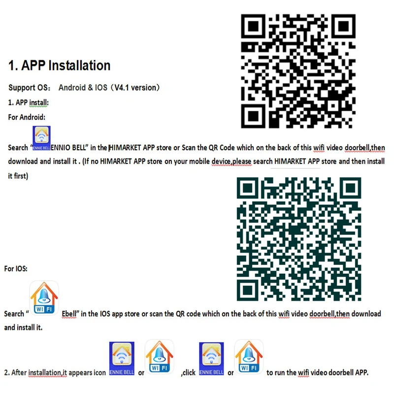 Search (ENNIO BELL) in the HIMARKET APP store or Scan the QR Code which on the back of this WIFI video doorbell, then download and install it . (If no HIMARKET APP store on your mobile device, please search HIMARKET APP store and then install it first)
