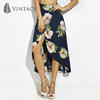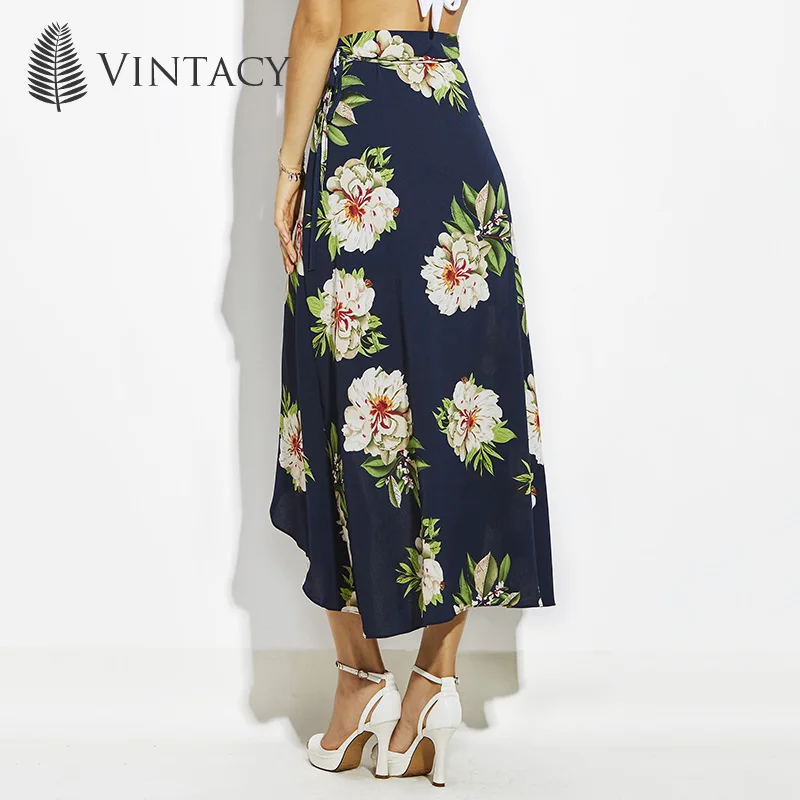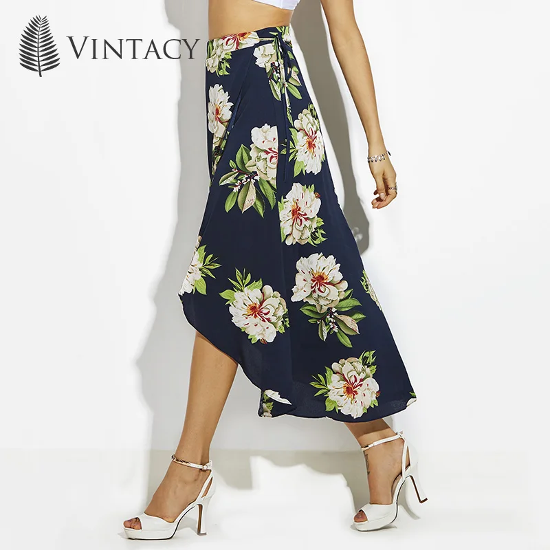 Vintacy Floral Print Skirts Women Dark Blue Asymmetrical Split Open Sexy Midi Skirt Beach Holiday Casual Summer Chiffon Skirts