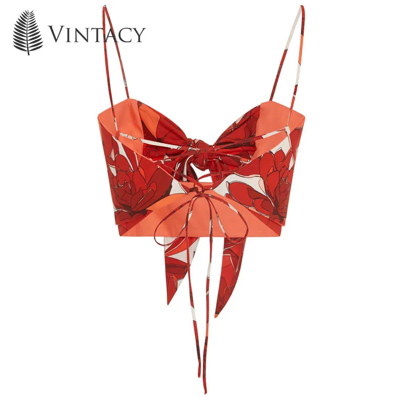 Vintacy Sexy Camisole Crop Top Women Strap Bow Knot Lace Up Tank Top Red Floral Female Backless Sleeveless Beach Cropped Cami
