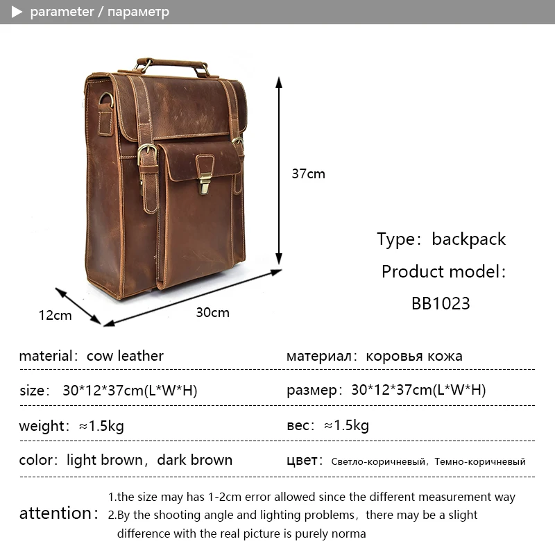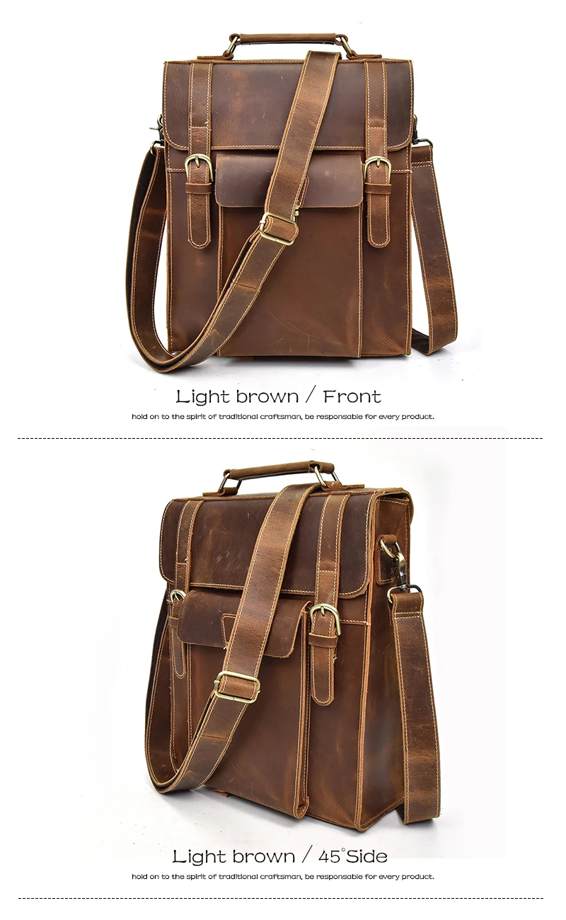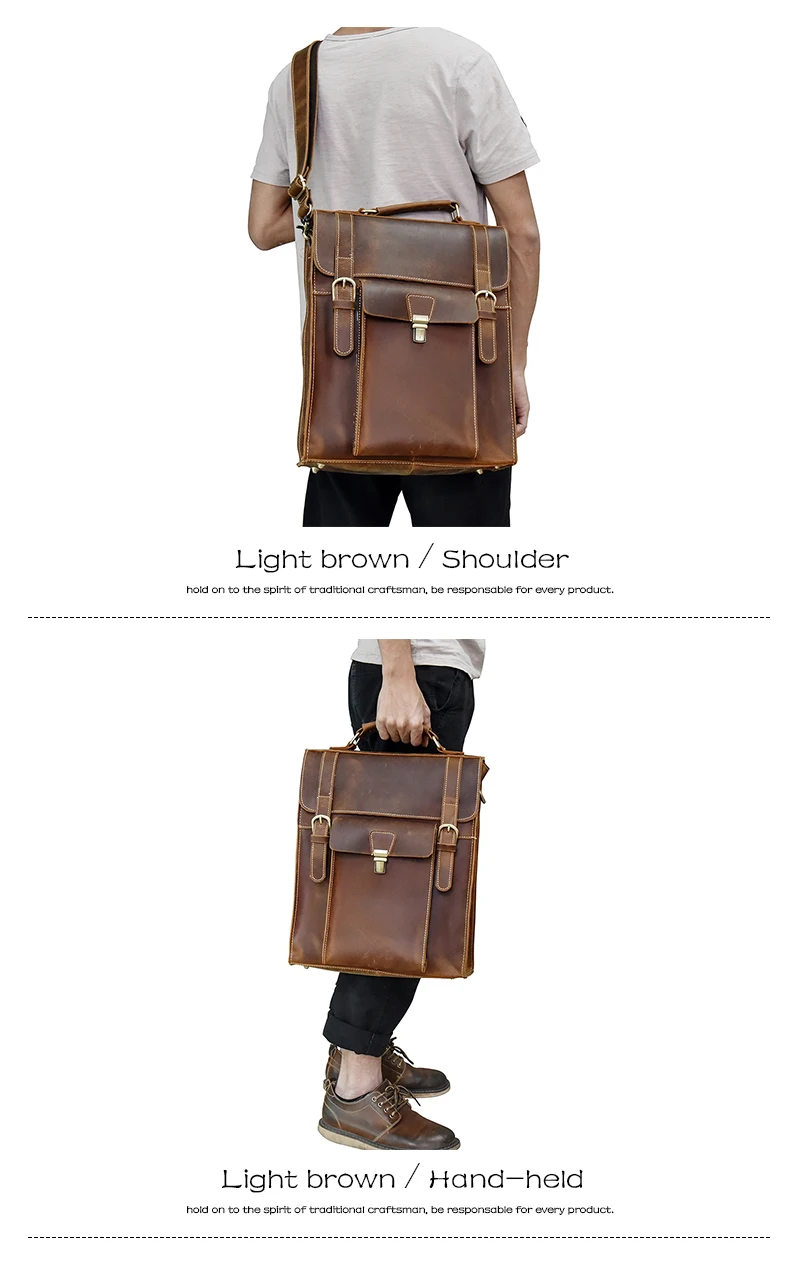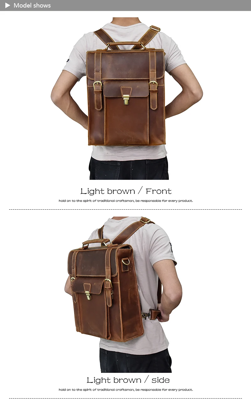 This is Genuine Leather Men’s Backpack Crazy Horse Cow Leather Daypack Large Capacity Travel Tote Bag With Retractable Belt Brown, it is easy and comfortable to carry it on your back or carry it in your hand.