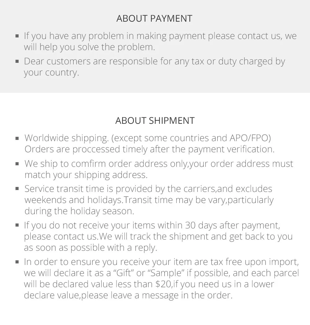 We are not responsible for any custom fees once the items have shipped. By purchasing our products, you consent that one or more packages may be shipped to you and may get custom fees when they arrive in your country.