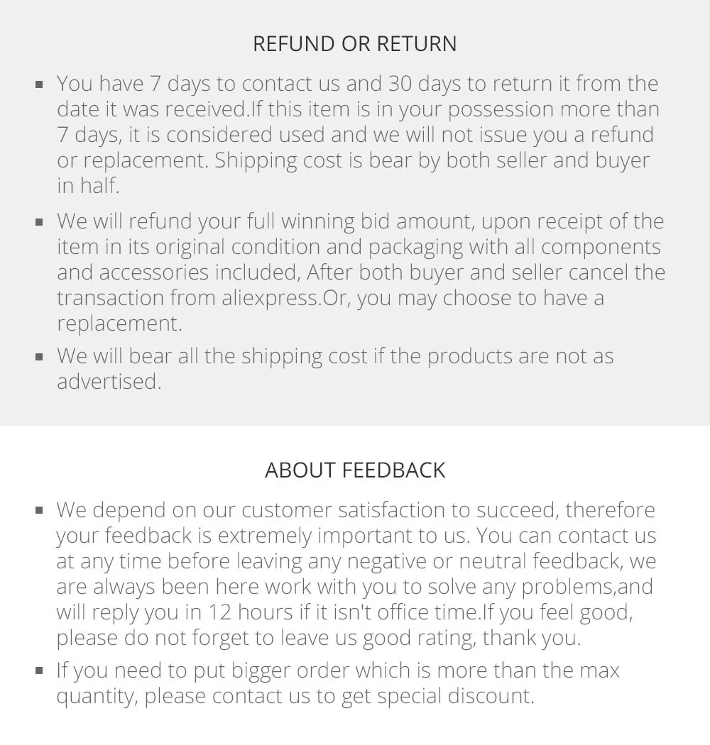 • If you did not receive the product within the guaranteed time( 45 days not including 2-5 day processing) you can request a refund or a reshipment.