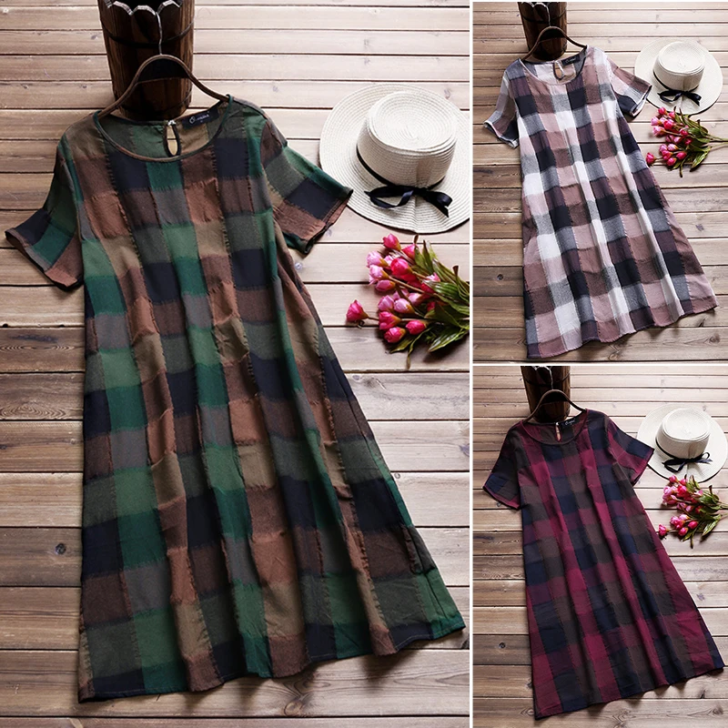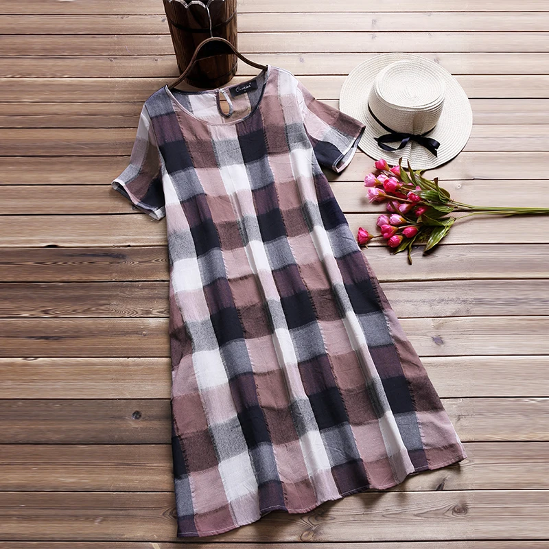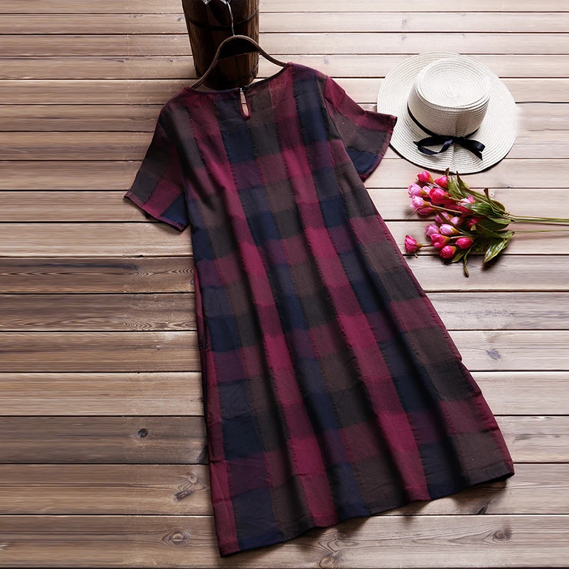 Vintage Summer Dress Women Plaid Long Top Female Elegant Short Sleeve Shirt Dresses Beach Sarafans Vestido Robe Plus Size 5XL