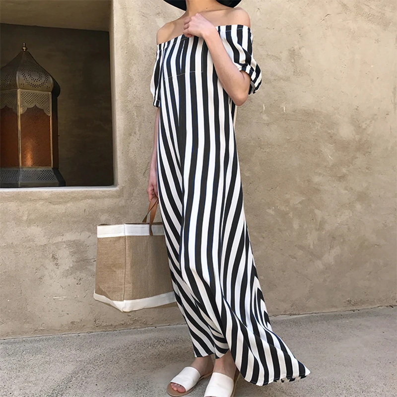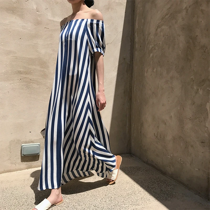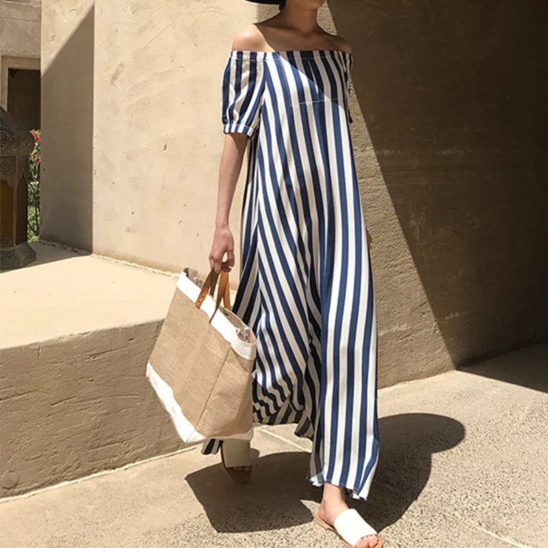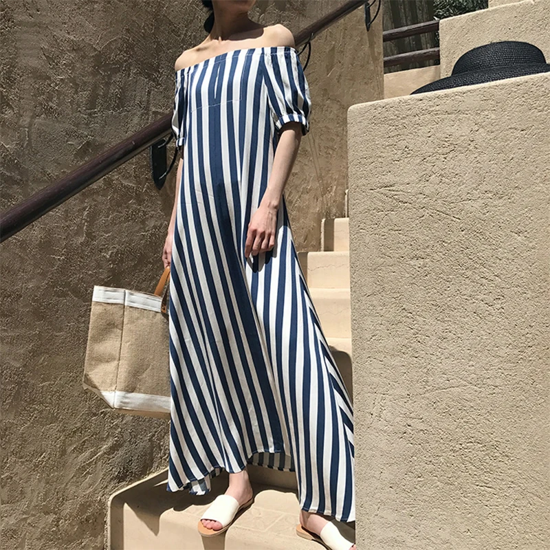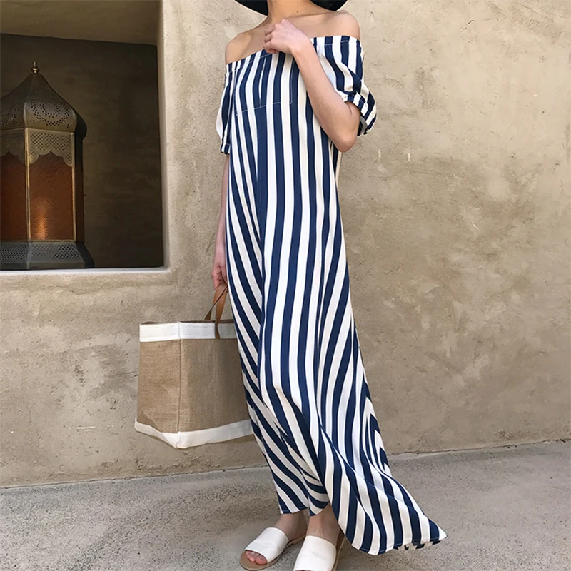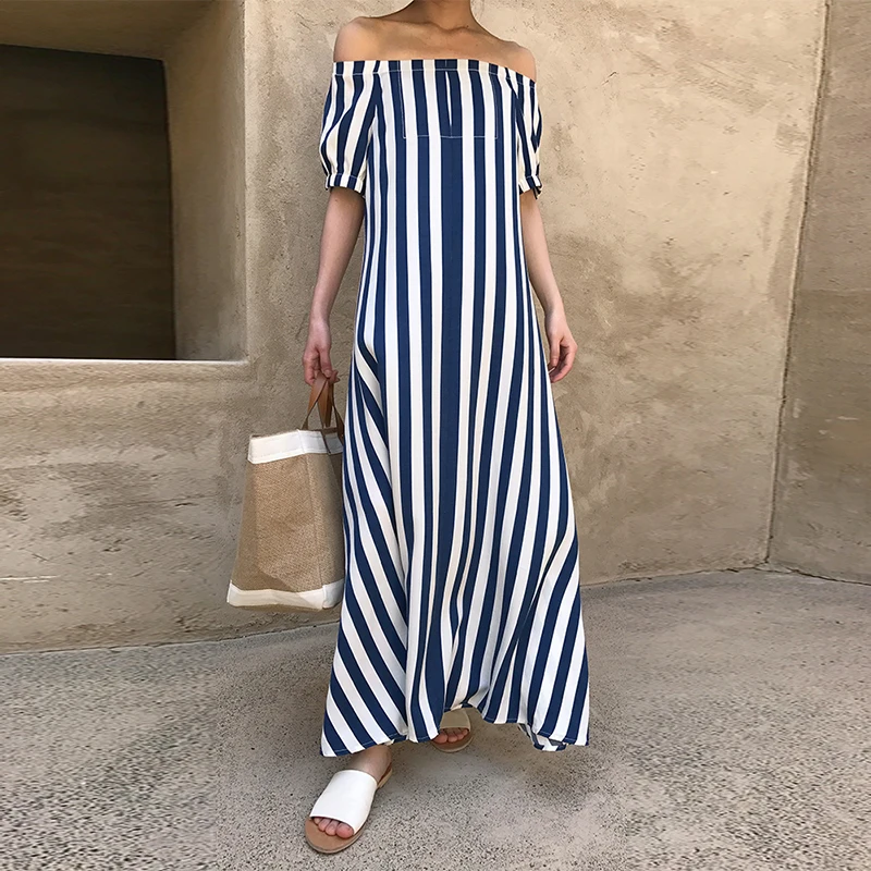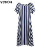 VONDA Women Striped Dress 2018 Summer Bohemian Casual Sexy Maxi Long Dresses Slash Neck Off Shoulder Vestidos Plus Size
