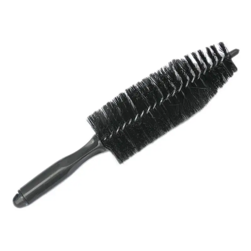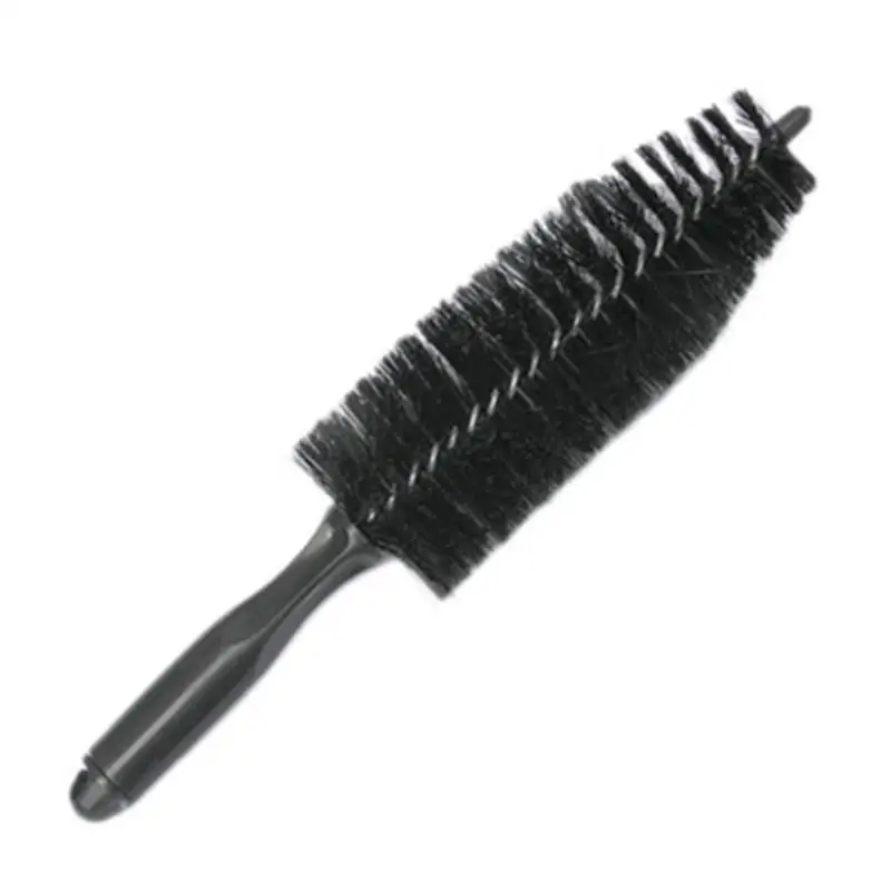 This is a premium car cleaning brush. This brush has a stronger clean effect. It is used to clean car or motorcycle spoke, tire rim and wheel or any wheels surface and rim. The faux bristles is enough to attack tough road grease and grime on your wheels. Plastic round handle is convenient to grip, built in hook for hanging to keep clean and dry. Good choice for your car.