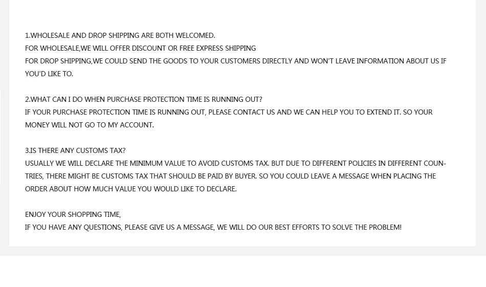 We are not responsible for any custom fees once the items have shipped. By purchasing our products, you consent that one or more packages may be shipped to you and may get custom fees when they arrive in your country.